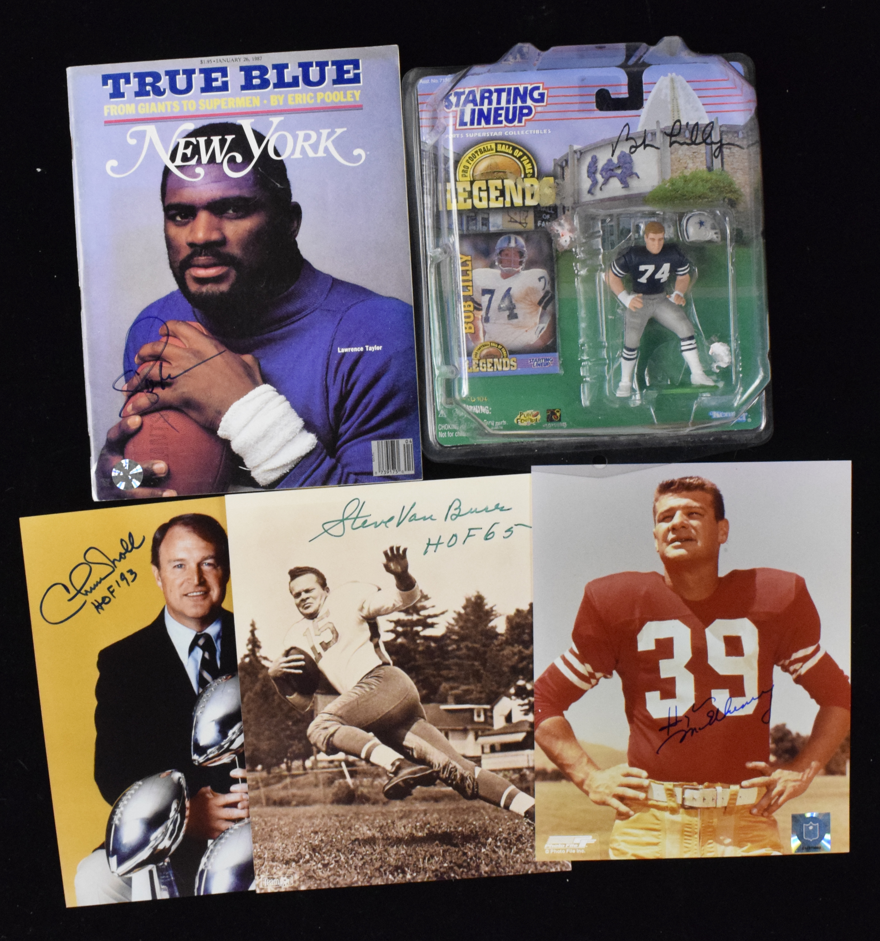 Description:Football HOFers autograph lot (EX-NM/MT). Includes (11) signed 8"x10" photos: Chuck Noll with "HOF 93" inscription, Steve Van Buren with "HOF 65" inscription, Hugh McElhenny, Dave Wilcox with "HOF 2000" inscription, John Mackey, Ron Mix, Rod Woodson, Carl Eller, Mike Haynes, Jackie Smith with "HOF 94" inscription, and Jan Stenerud with "HOF 1991" inscription; 1998 Starting Lineup signed on the package by Bob Lilly; and 1/26/1987 New York magazine signed by Lawrence Taylor. Signatures rate 7 (Taylor) to 10 (avg 8/9) out of 10: EX-NM/MT
