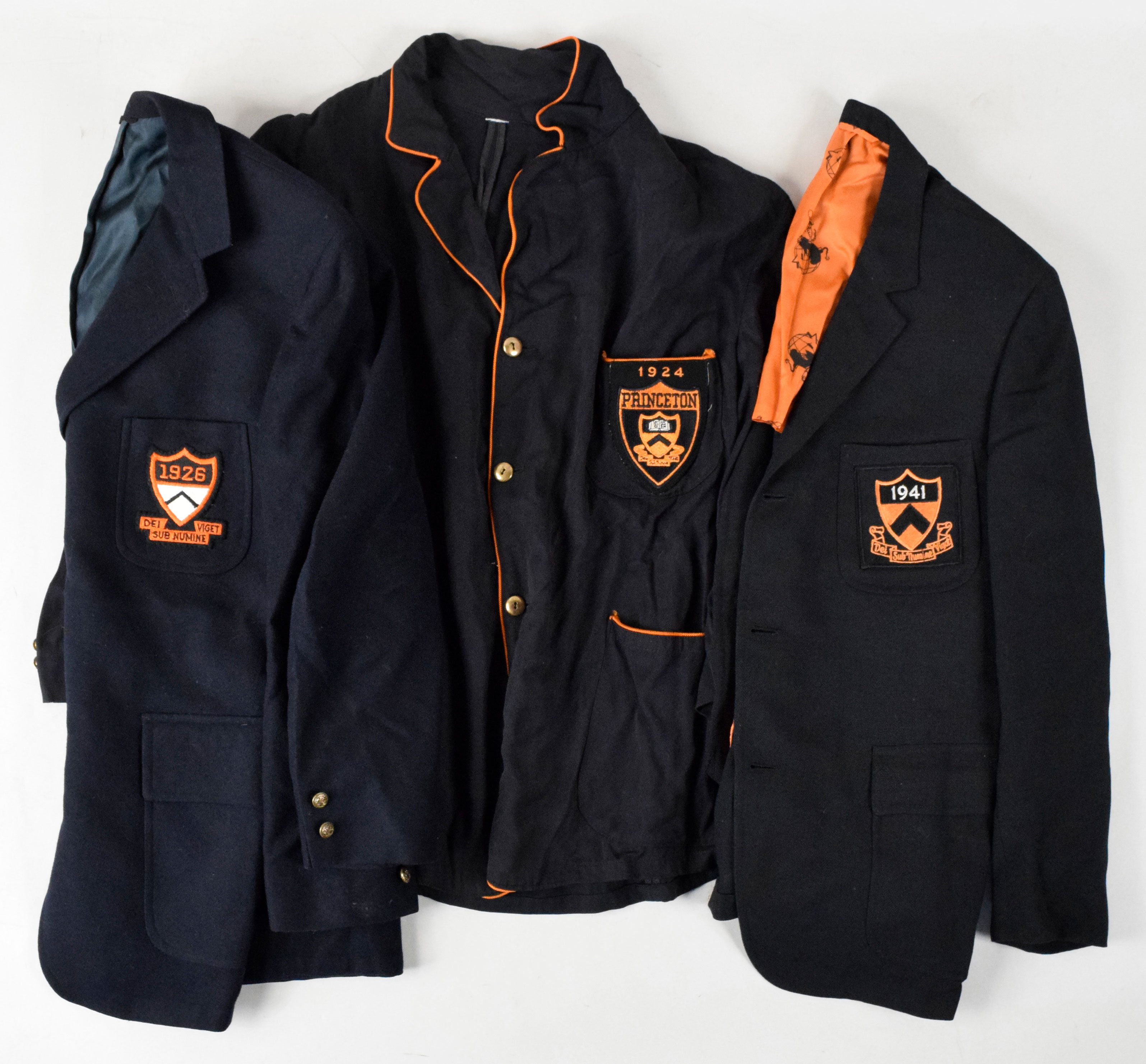 Description:1924, 1926, and 1941 Princeton University blazers (EX-EX/MT). All three have the year patch on the chest pocket. Unknown if blazers are from the same era as the patch, or if the patches were later sewn on blank blazers: EX-EX/MT