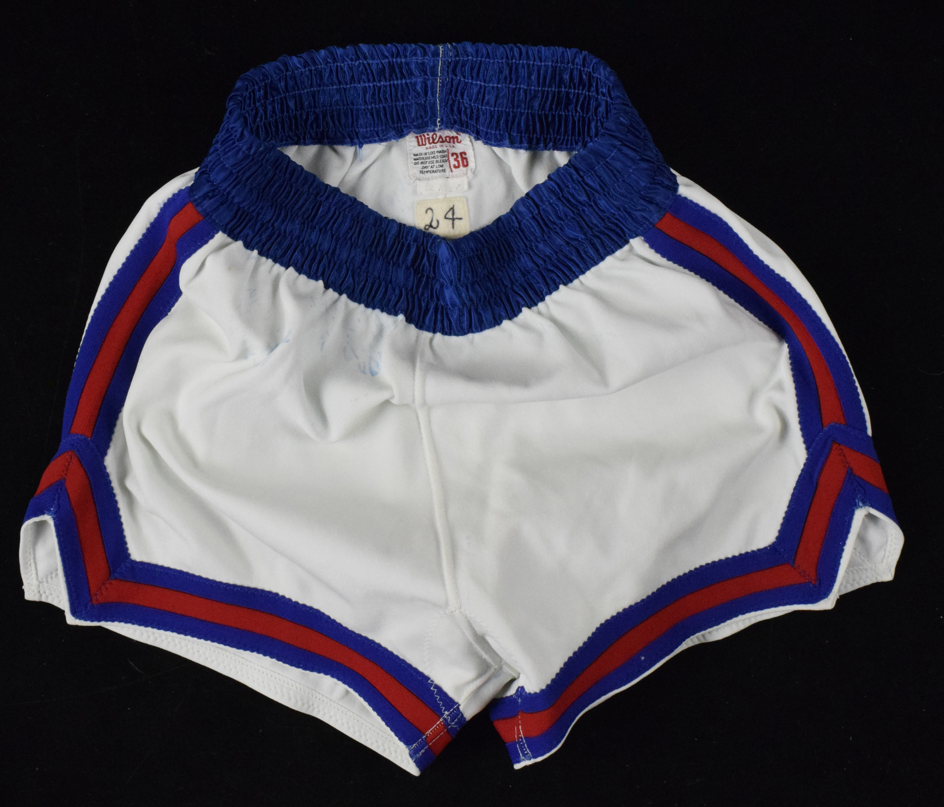 Description:Wali Jones professional model Philadelphia 76ers shorts, c.1967-70 (EX). Wilson size 36 shorts with "24" player number tag and additional size flag tag on the interior below the Wilson tag. Stains/discoloration on the front and back: EX