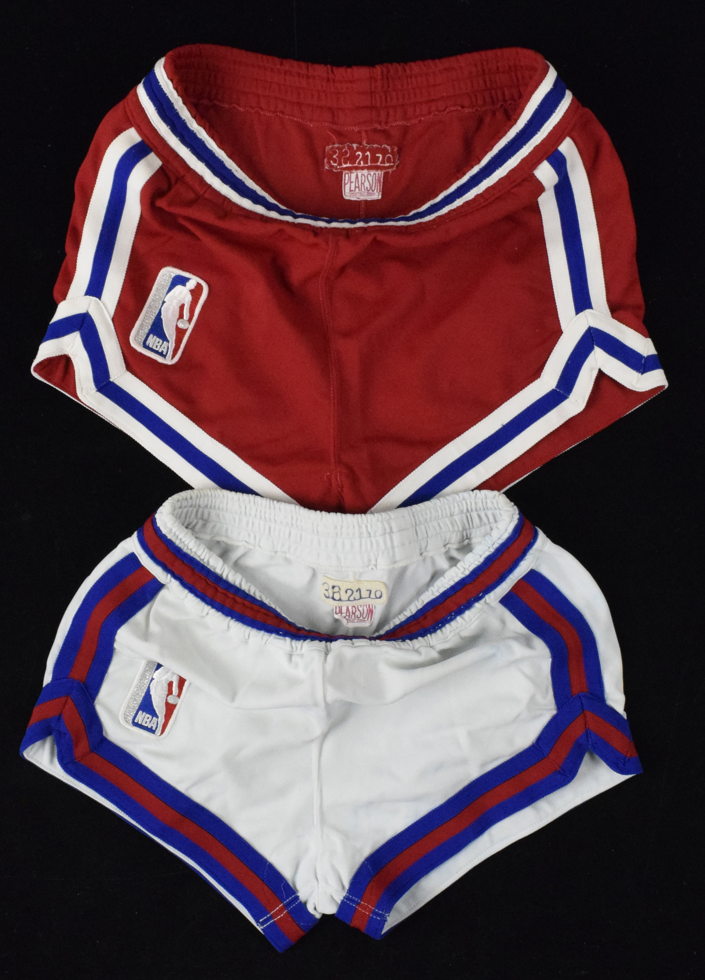 Description:1970 Archie Clark home & road Philadelphia 76ers professional model shorts (EX-EX/MT). Red and white Pearson brand shorts both having "32 21 70" strip tag sewn on the interior under the back waist. Staining/discoloration on the white shorts: EX-EX/MT