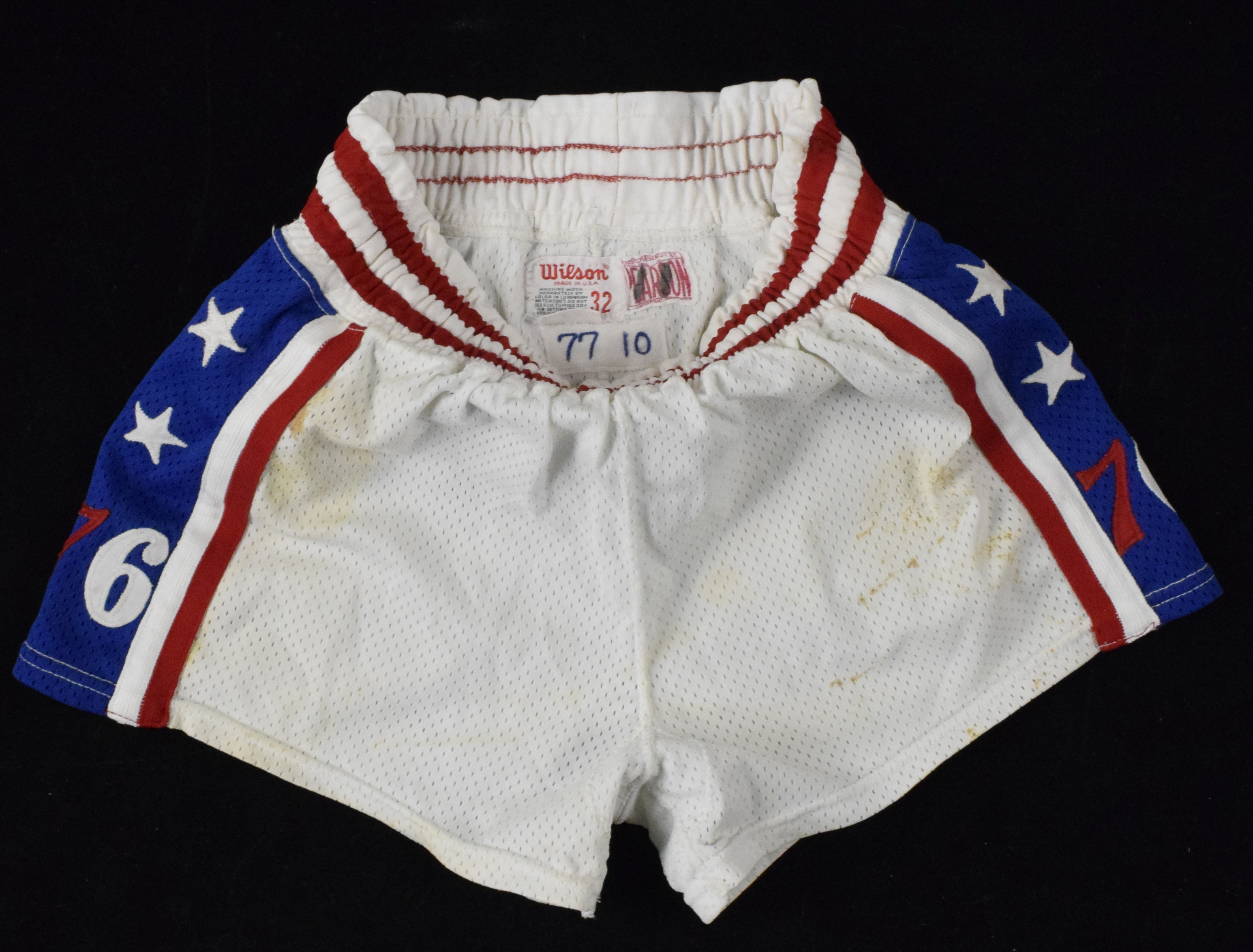 Description:1977 Mike Dunleavy professional model Philadelphia 76ers shorts (EX). Wilson / Pearson Sporting Goods size 32 shorts with "77 10" year/number chain-stitched tag, along with additional 1/2"-1/2"-1" flag tag on the interior under the back waist. Tremendous use with stains on the front and back: EX