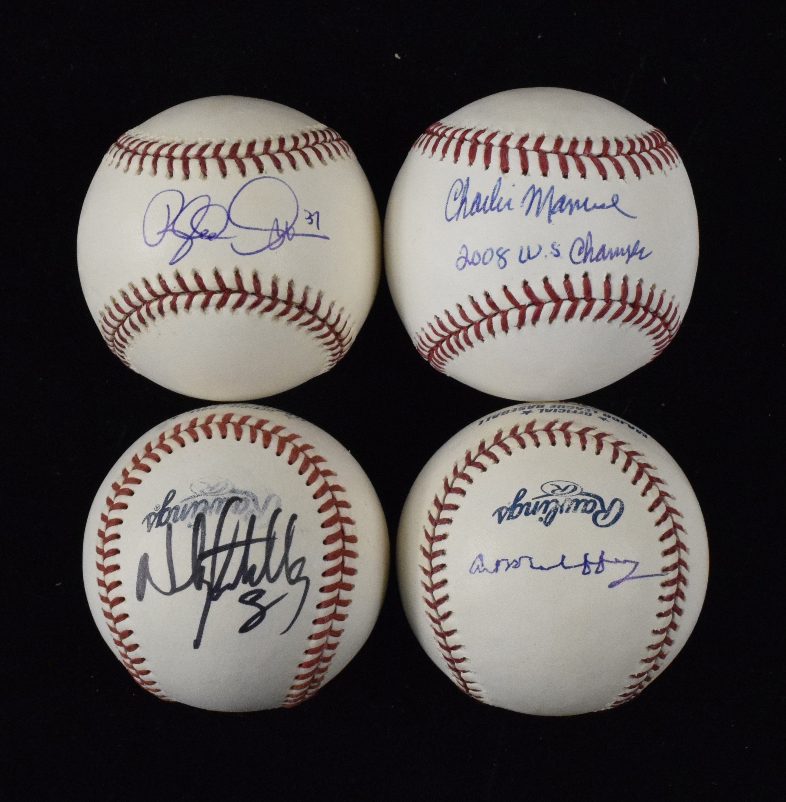 Description:Lot of (27) mostly Philadelphia Phillies signed baseballs (VG/EX-NM/MT). All are signed on official MLB balls unless noted otherwise. Includes Charlie Manuel with "2008 WS Champs" inscription, Rheal Cormier (MLB Authenticated), Art Mahaffey, Nick Castellanos on a used Florida State League ball (PSA), Randy Wolf, Juan Pierre, Domonic Brown, (2) Jeff Francoeur, (2) Tyler Clippard, Maikel Franco, (2) Tommy Joseph, Vance Worley, Chad Durbin (MLB Authenticated), Vince Velazquez, (2) Cody Asche, (2) Dylan Cozens (both MLB Authenticated), Lou Marson (MLB Authenticated), and others. Signatures rate 6/7 to 9/10 (avg 8) out of 10. Most balls appear to average EX/MT overall. Range: VG/EX-NM/MT