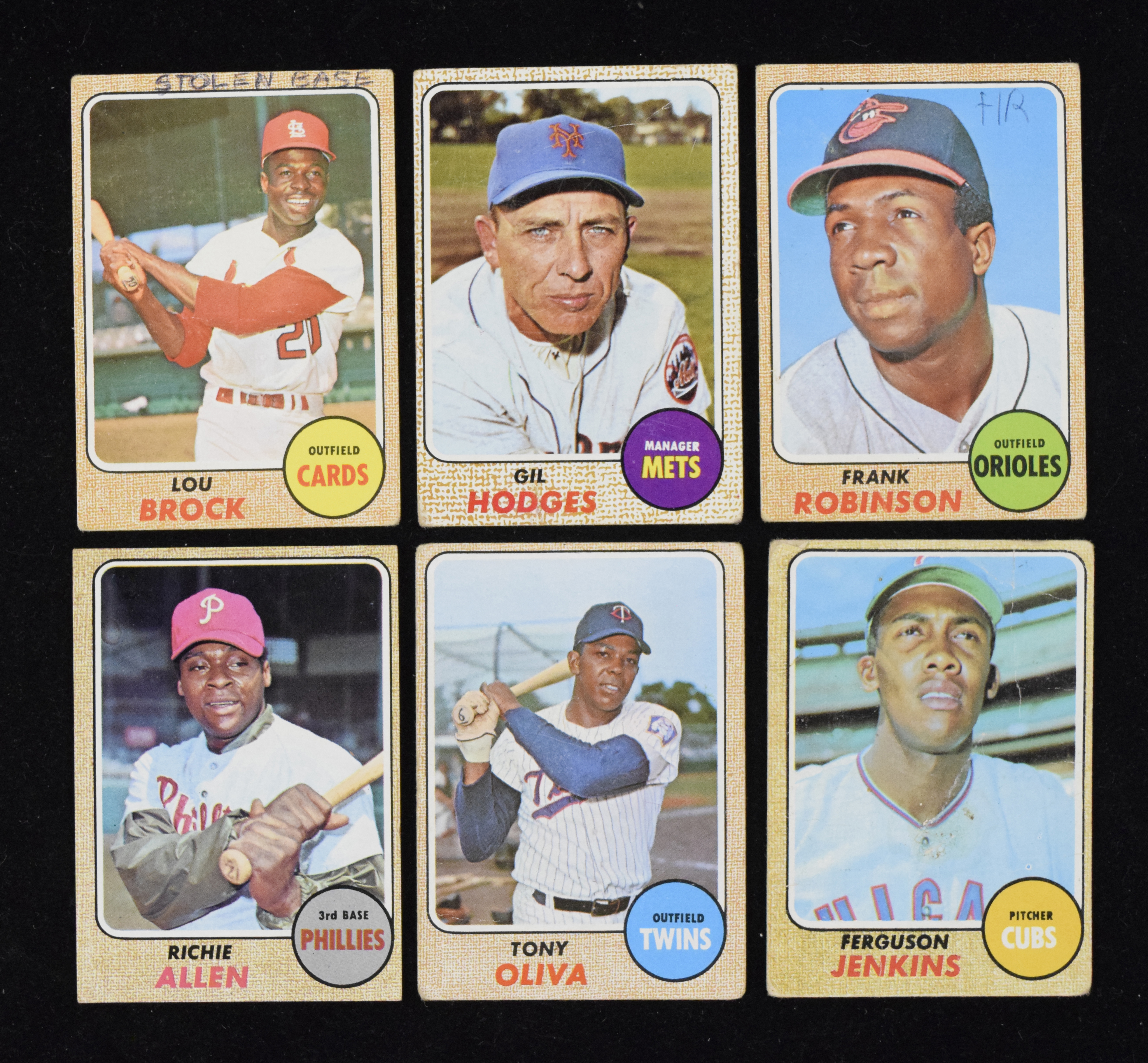 Description:1968 Topps partial set approx. (410/598) with minor stars (PR-EX). Generally low-grade partial set has approx. 410 different cards of the 598 issued, including (43) cards from the final series (#s 458-598). Lot includes mostly commons and minor stars with a few stars mixed in. Highlights include #s 27 Gil Hodges, 30 Joe Torre, 99 Rocky Colavito, 165 Tony Oliva, 225 Richie Allen, 256 Norm Cash, 257 Phil Niekro, 390 Bill Mazeroski, 410 Fergie Jenkins, 500 Frank Robinson (writing), 520 Lou Brock (writing) and more. Lot appears mostly VG-VG/EX with some better and some worse. Range: PR-EX, including several with writing and a few trimmed.