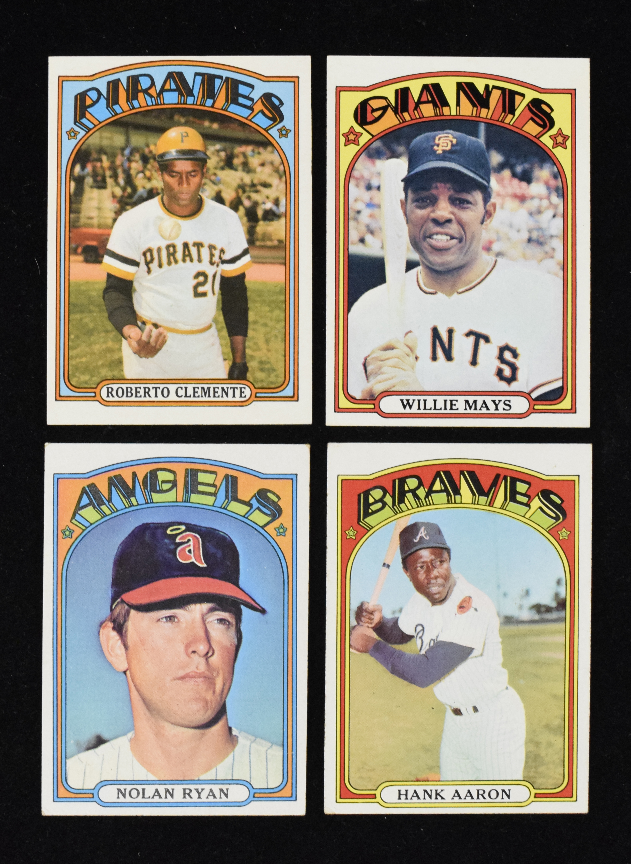 Description:Lot of (4) 1972 Topps HOFers, with Ryan, Mays, Clemente and Aaron (GD-NM). Nice lot of key cards from the 1972 Topps set, with #s 49 Willie Mays (NM), 299 Hank Aaron (GD), 309 Roberto Clemente (EX OC; miscut on reverse) and 595 Nolan Ryan (VG/EX). Range: GD-NM.