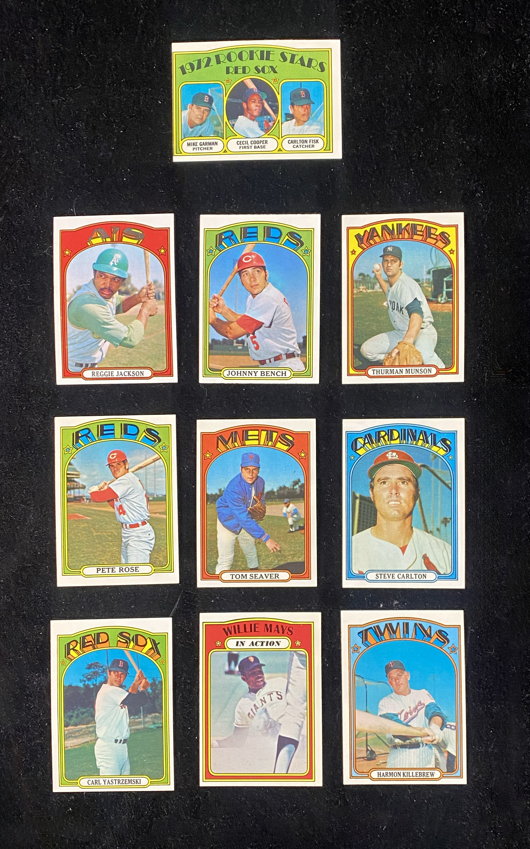 Description:Clean lot of (10) 1972 Topps stars and HOFers, incuding Rose, Seaver and Fisk RC (Miscut-NM OC). Very nice lot of key cards from the 1972 Topps set includes #s 37 Carl Yastrzemski (NM OC), 50 Willie Mays IA (NM OC), 51 Harmon Killebrew (NM OC), 79 Carlton Fisk RC (miscut), 420 Steve Carlton (NM OC), 433 Johnny Bench (EX/MT), 435 Reggie Jackson (EX/MT), 441 Thurman Munson (EX/MT), 445 Tom Seaver (EX/MT) and 559 Pete Rose (EX). Range: Miscut-NM OC.
