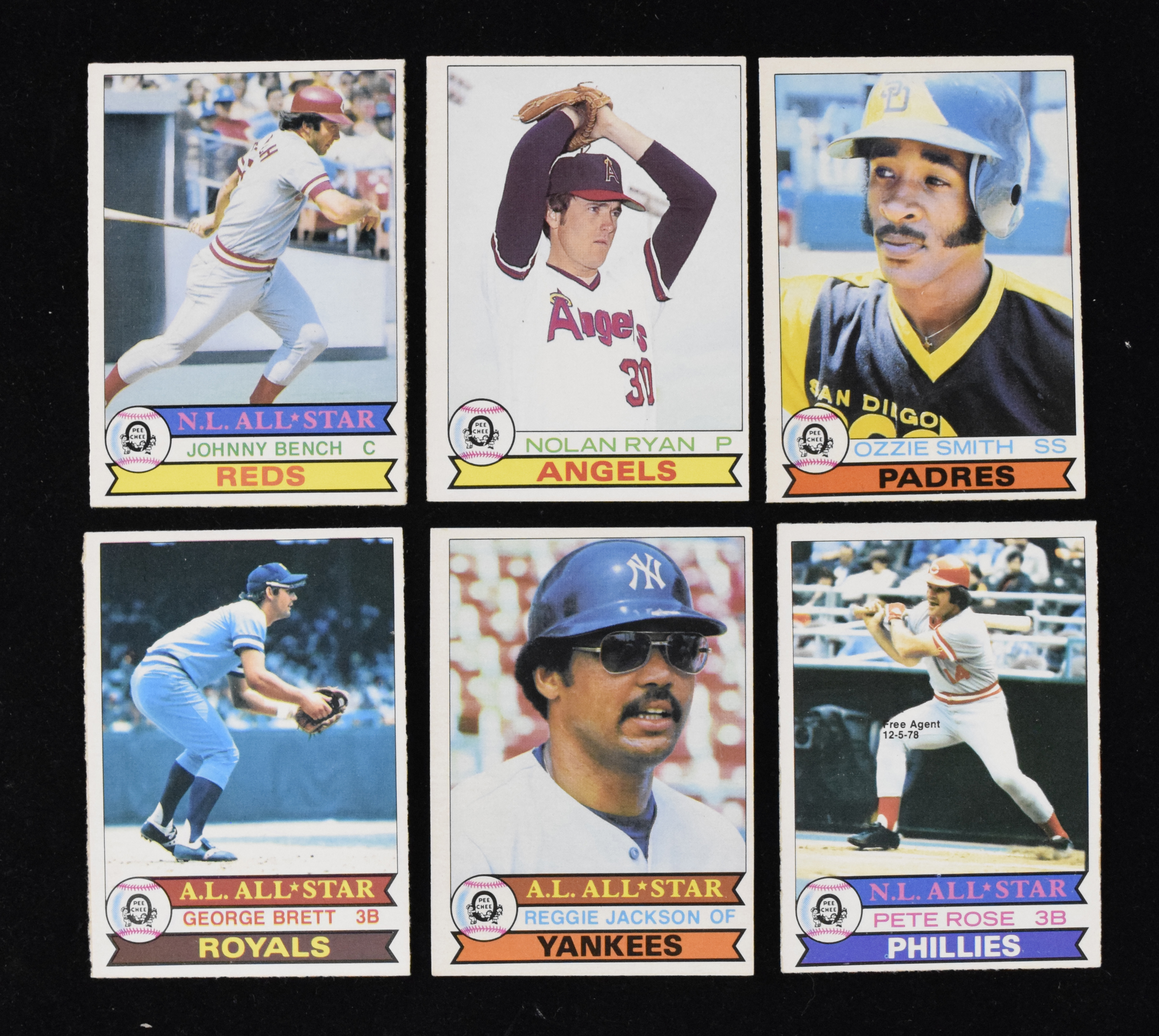 Description:1979 O-Pee-Chee baseball complete set (374) with Ozzie Smith RC (EX-NM/MT). Nice 1979 O-Pee-Chee complete set of (374) cards is highlighted by the #52 rookie card of Ozzie Smith (NM OC), as well as numerous stars and Hall of Famers, such as #s 51 Nolan Ryan (NM OC), 101 Johnny Bench (NM OC), 167 George Brett (NM), 374 Reggie Jackson (NM OC), 343 Pete Rose (NM OC) and others. Most of the cards in the set have sharp corners, but many are beset by centering problems (including miscuts) as is often found in the 1979 OPC issue. Range: EX-NM/MT (with note on centering).