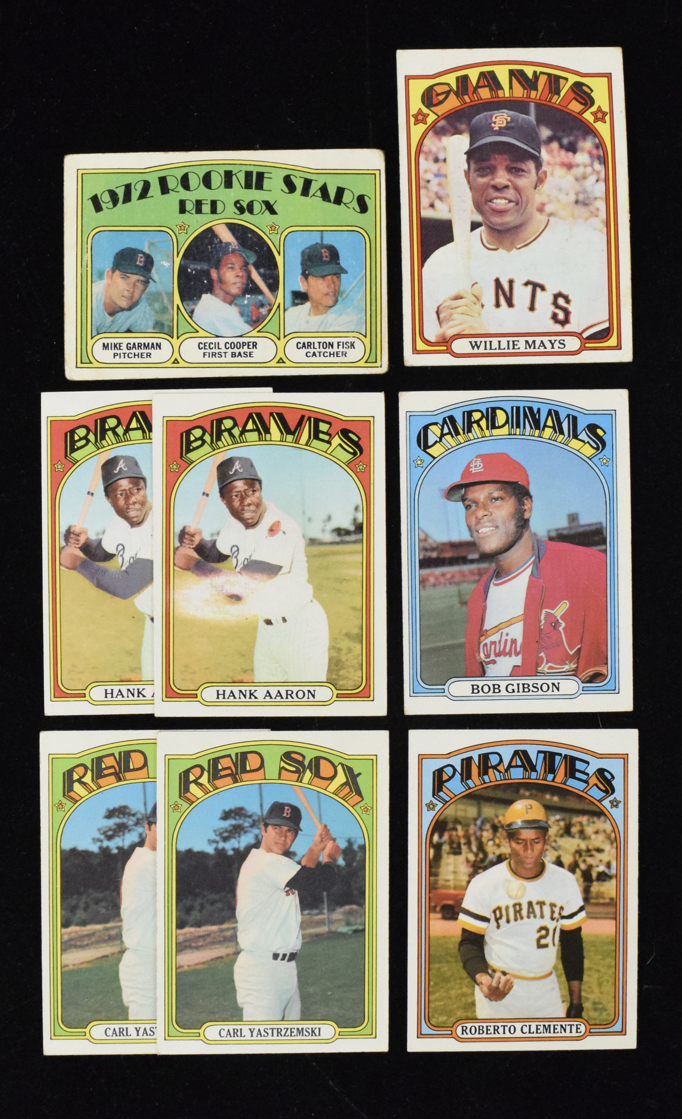 Description:Must-see lot of (55) 1972 Topps key cards with (8) Hank Aaron, (6) Roberto Clemente (PR-EX/MT). High-value but low-grade lot of 1972 Topps key cards features major duplication of nearly every card. Includes (2) 79 Carlton Fisk RC; (6) #49 Willie Mays; (8) #299 Hank Aaron; (6) #309 Roberto Clemente; (8) #435 Reggie Jackson; (13) #37 Carl Yastrzemski and (12) #130 Bob Gibson. Cards are generally GD with some better and some worse. Range: PR-EX/MT.