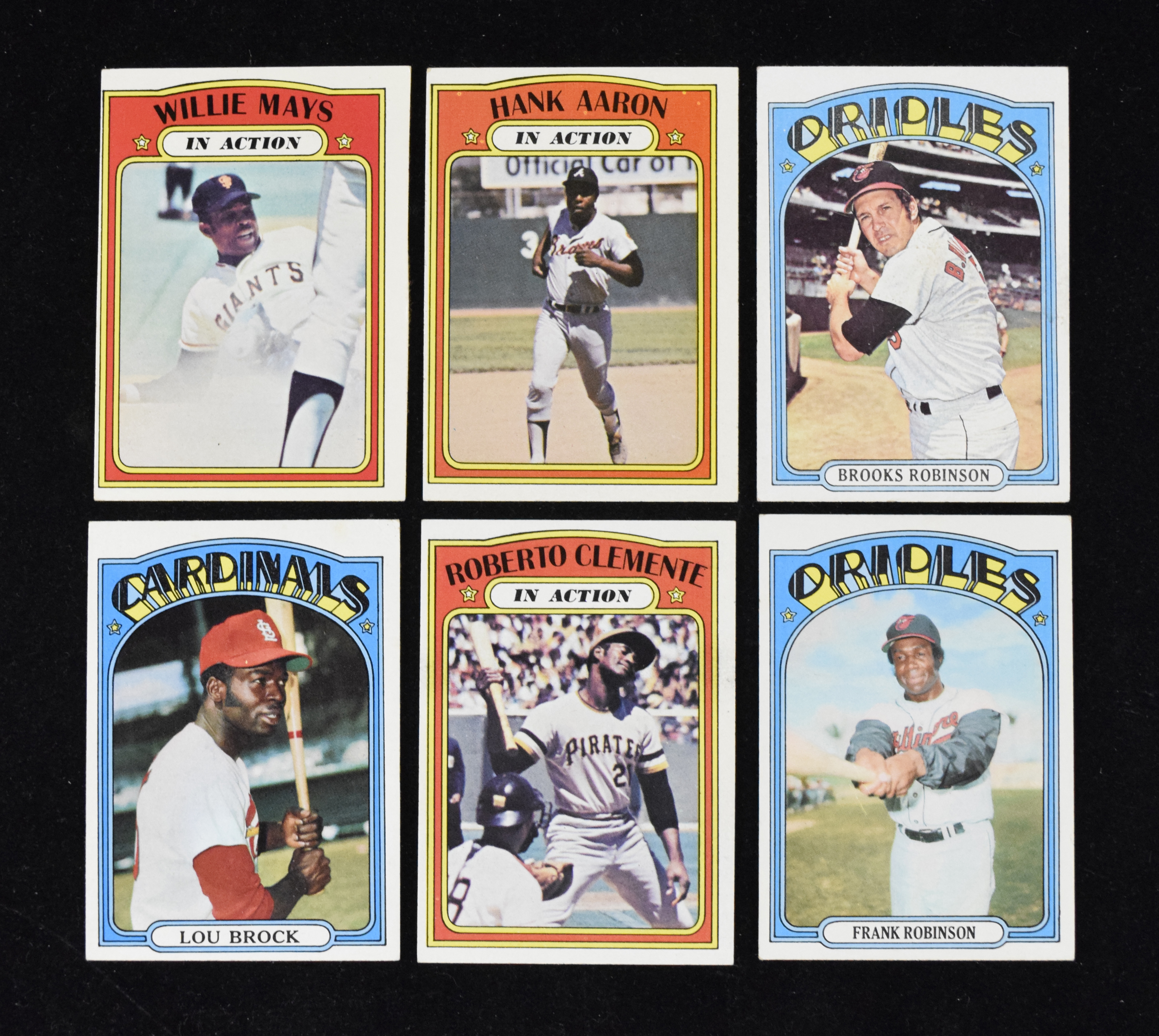 Description:Must-see lot of (175) 1972 Topps HOFers, with (12) Willie Mays IA, (9) Hank Aaron IA (PR-EX/MT). High-value but low-grade lot of 1972 Topps cards, with nearly every card a Hall of Famer and major duplication of each. Highlights include #s (4) 310 Roberto Clemente IA, (6) 447 Willie Stargell, (2) 441 Thurman Munson, (4) 51 Harmon Killebrew, (9) 100 Frank Robinson, (9) 300 Hank Aaron IA, (4) 550 Brooks Robinson, (8) 200 Lou Brock, (12) 50 Willie Mays IA, (2) 530 Don Sutton, (4) 270 Jim Palmer, (13) 38 Carl Yastrzemski IA, (5) 280 Willie McCovey, (7) 446 Tom Seaver IA, (9) 436 Reggie Jackson IA and many more. Cards are generally GD with some better and some worse, including some with tape. Range: PR-EX/MT.
