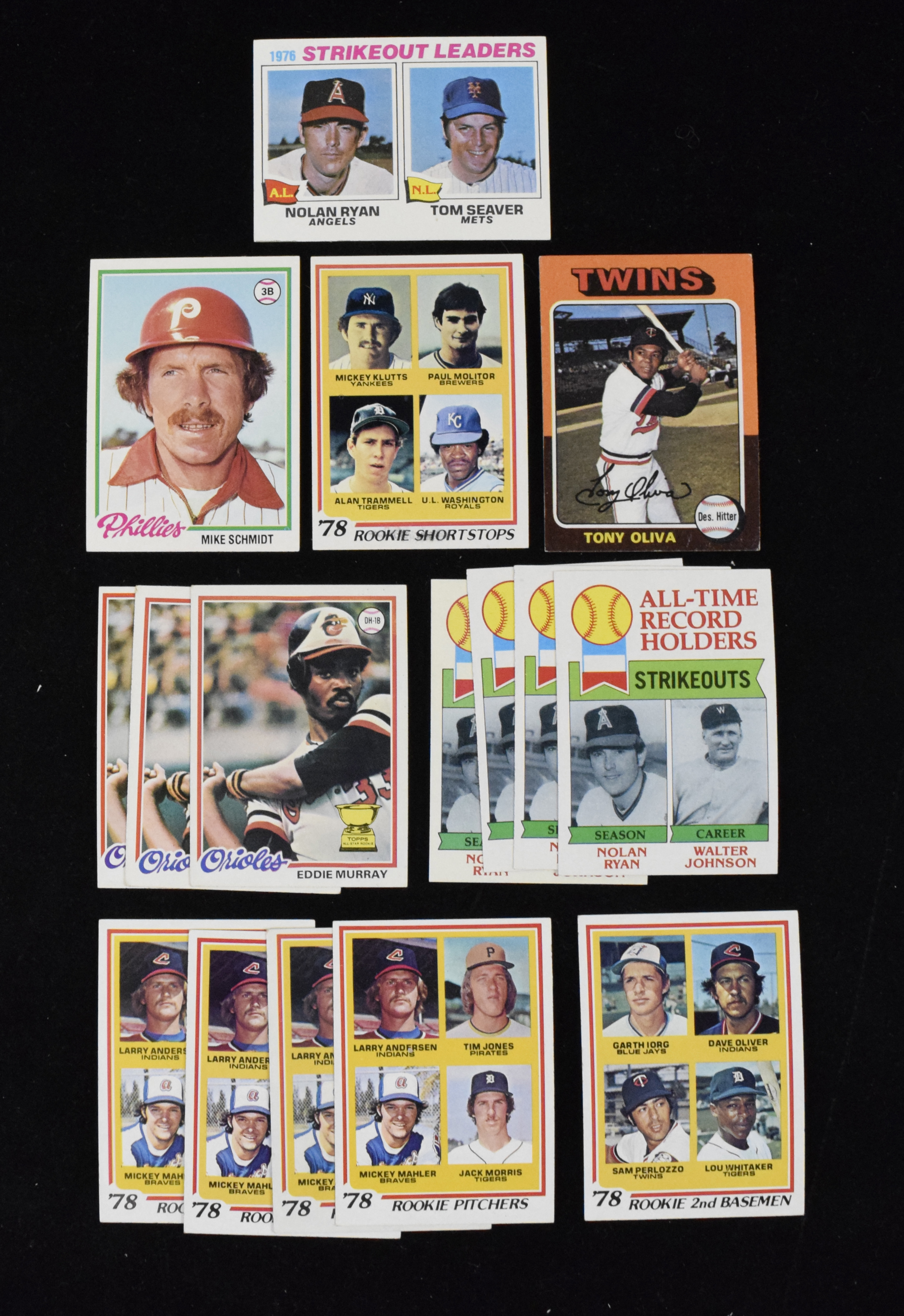 Description:Lot of approx. (2,900) 1975-1979 Topps cards with HOFers and RCs (EX-NM/MT overall). Excellent quantity (with duplication) of unsorted mid- to late-1970s Topps cards features approx. (300) 1975 Topps; (100) 1976 Topps; (400) 1977 Topps; (1,500) 1978 Topps and (600) 1979 Topps. A cursory review of the lot reveals commons, minor stars and stars and Hall of Famers, including 1978 Topps #s: (3) 36 Eddie Murray RC, (4) 703 Jack Morris RC, 704 Lou Whitaker RC, 360 Mike Schmidt, 707 Paul Molitor RC; 1977 Topps #6 Nolan Ryan/Tom Seaver; 1975 Topps #325 Tony Oliva; 1979 Topps: (4) 417 Nolan Ryan/Walter Johnson and many more HOFers waiting to be found. Lot is in clean condition overall, though a small portion of the 1978s (less than 100) appear to have suffered water damage (PR). Most appear EX-NM/MT. Range: PR-NM/MT.