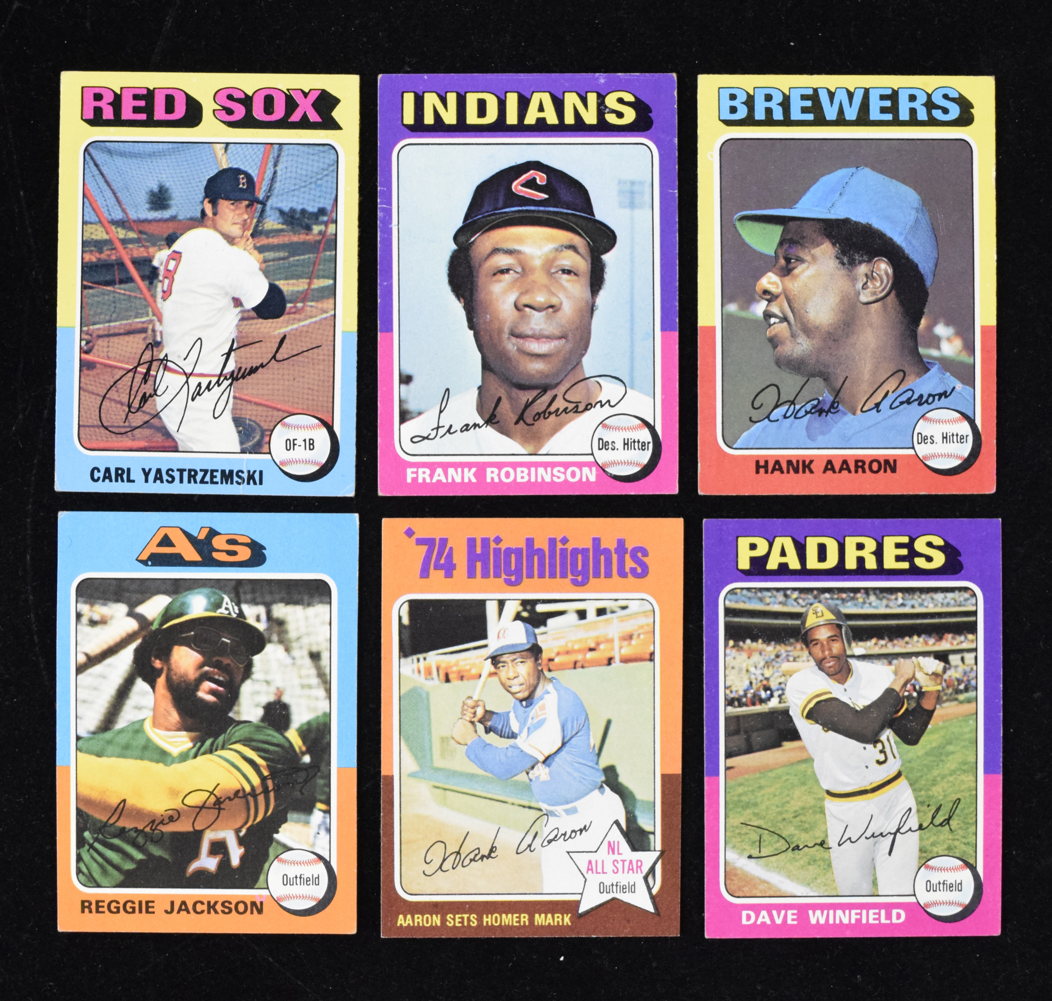 Description:Lot of (80) 1975 Topps cards with many HOFers, including (2) Aaron, (5) Robinson (PR-NM). Lot of 1975 Topps cards features many Hall of Famers (with duplication). Highlights include #s 5 Nolan Ryan RB, (2) 540 Lou Brock, (2) 660 Hank Aaron, (3) 1 Hank Aaron RB, (5) 61 Dave Winfield, (6) 100 Willie Stargell, (2) 300 Reggie Jackson, (2) 20 Thurman Munson, (2) 335 Jim Palmer, 280 Carl Yastrzemski, 50 Brooks Robinson, (5) 580 Frank Robinson, (3) 450 Willie McCovey, (2) 600 Rod Carew, (2) 150 Bob Gibson, 640 Harmon Killebrew and more. Most appear VG-VG/EX with some better and some worse. Range: PR-NM (including a few with writing).