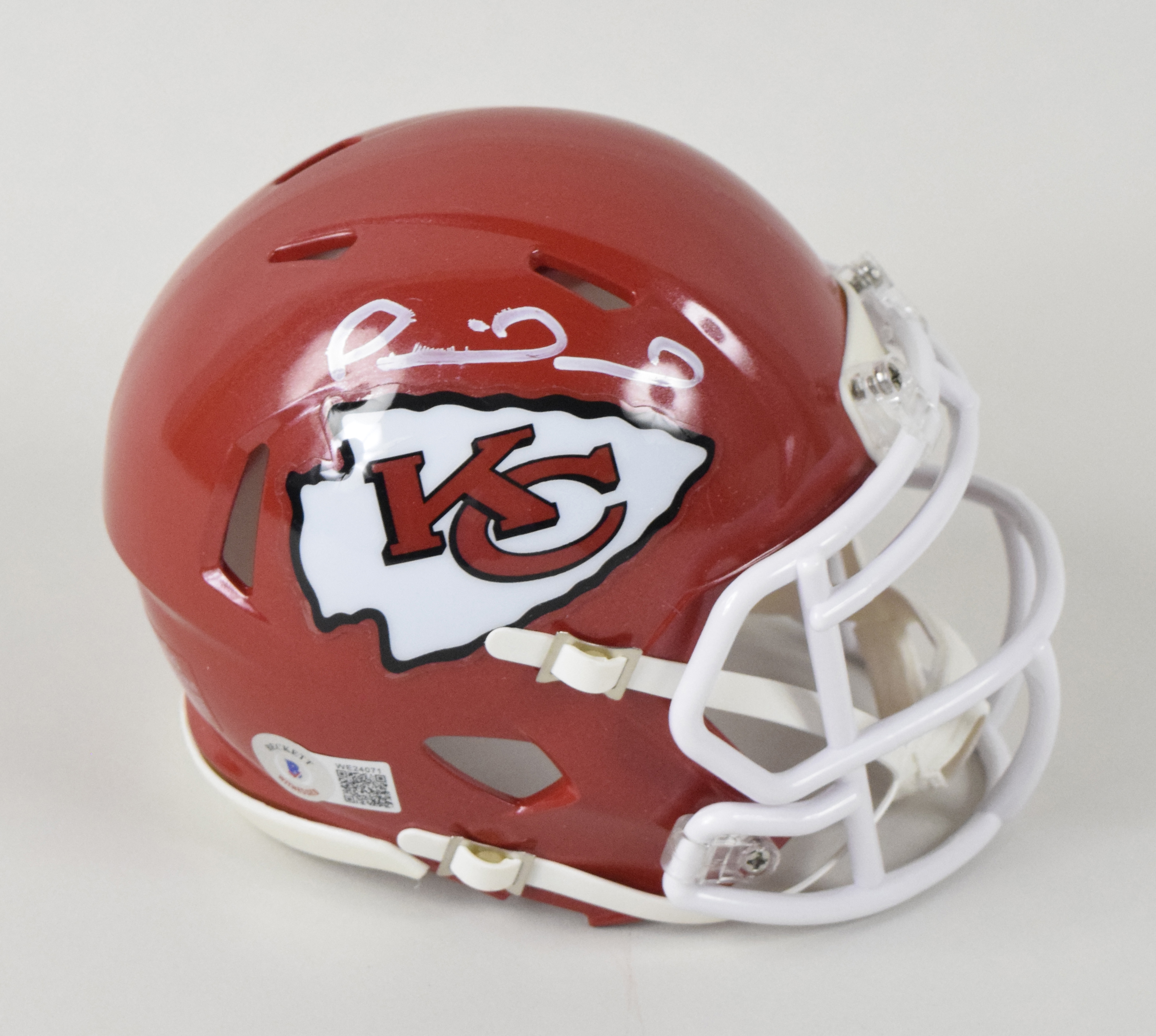 Description:Patrick Mahomes autographed Kansas City Chiefs mini-helmet with Beckett authentication (Sig. NM). Chiefs mini helmet (no manufacturer mark) has been signed in white marker by Patrick Mahomes, rating 7 out of 10 (very small smudge to signature). A Beckett Witnessed authentication sticker is affixed to the helmet, which shows little to no mentionable wear: NM/MT.