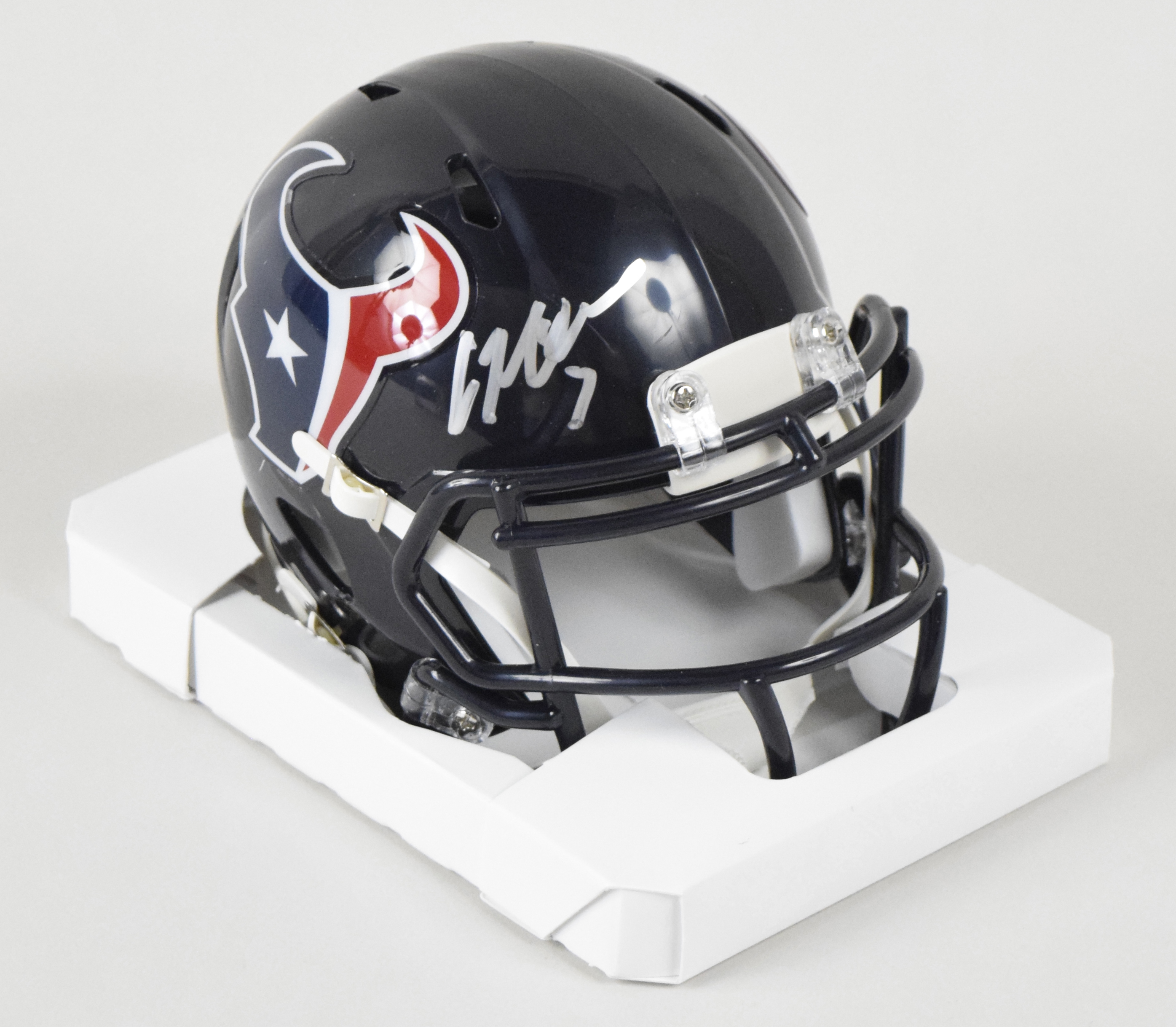 Description:C.J. Stroud autographed Houston Texans mini-helmet with Fanatics authentication (Sig. MT). Texans mini helmet (no manufacturer mark) has been signed in silver marker by C.J. Stroud, rating 9 out of 10. A Fanatics authentication sticker is affixed to the helmet, which shows little to no mentionable wear: NM/MT.