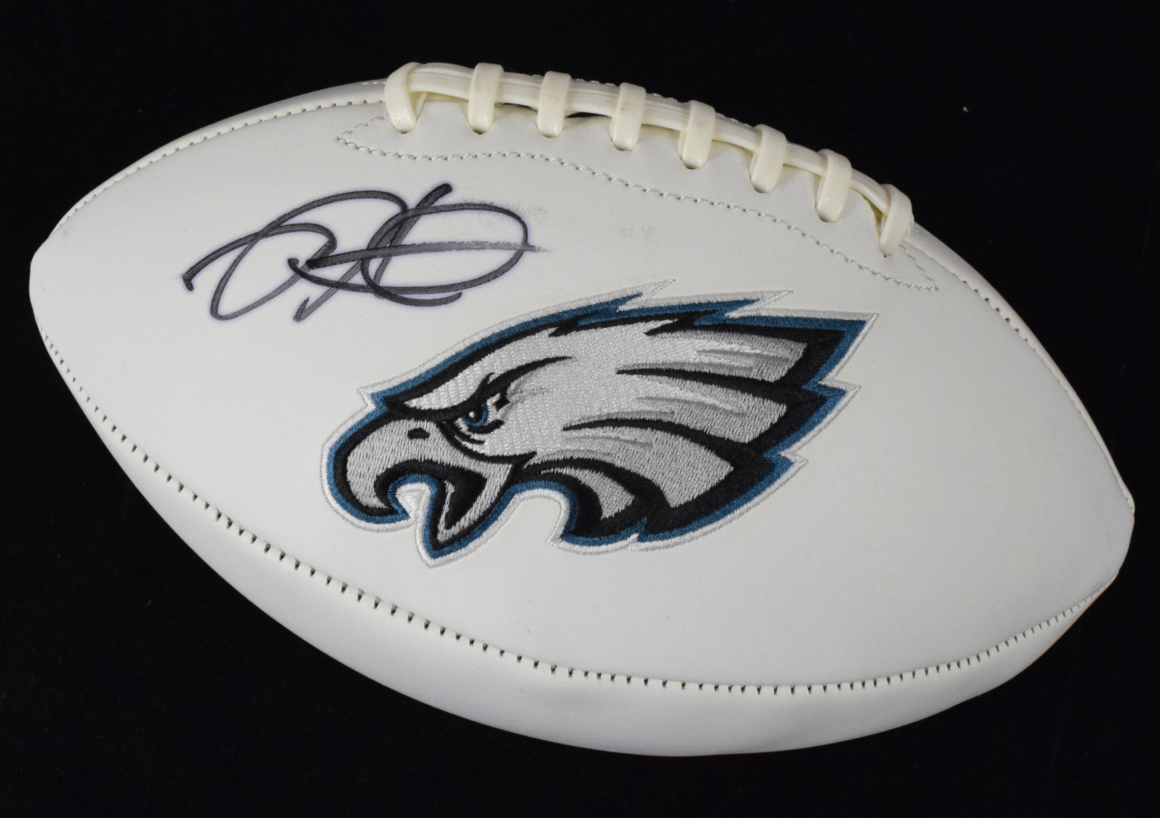 Description:Jalen Hurts autographed football with Eagles COA (Sig. NM/MT). Eagles logo white panel football has been signed in black marker by Jalen Hurts, rating 8 out of 10. Ball is slightly deflated and comes with a COA from the Eagles. Ball: EX/MT.