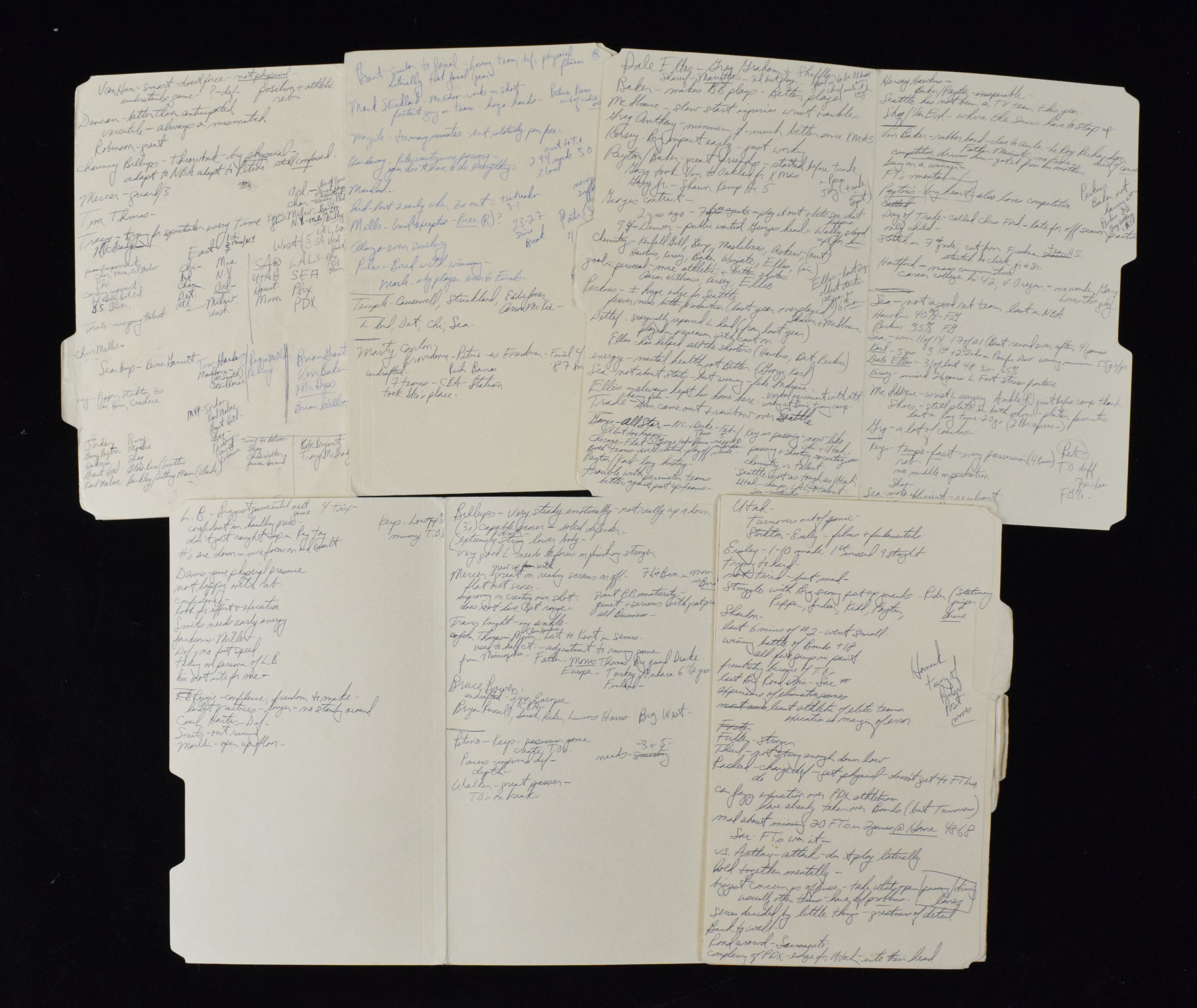 Description:Lot of Bill Walton handwritten NBA game notes (VG-EX/MT). Includes (8) 9.5"x14.5" folders/pages with Walton's broadcasting notes from various games. Walton mentions Michael Jordan, David Robinson, Tim Duncan, Tracy McGrady, Pat Riley, Tim Hardaway, Alonzo Mourning, Gary Payton, Chauncey Billups, and others. Includes certificate of provenance from Walton Family: VG-EX/MT