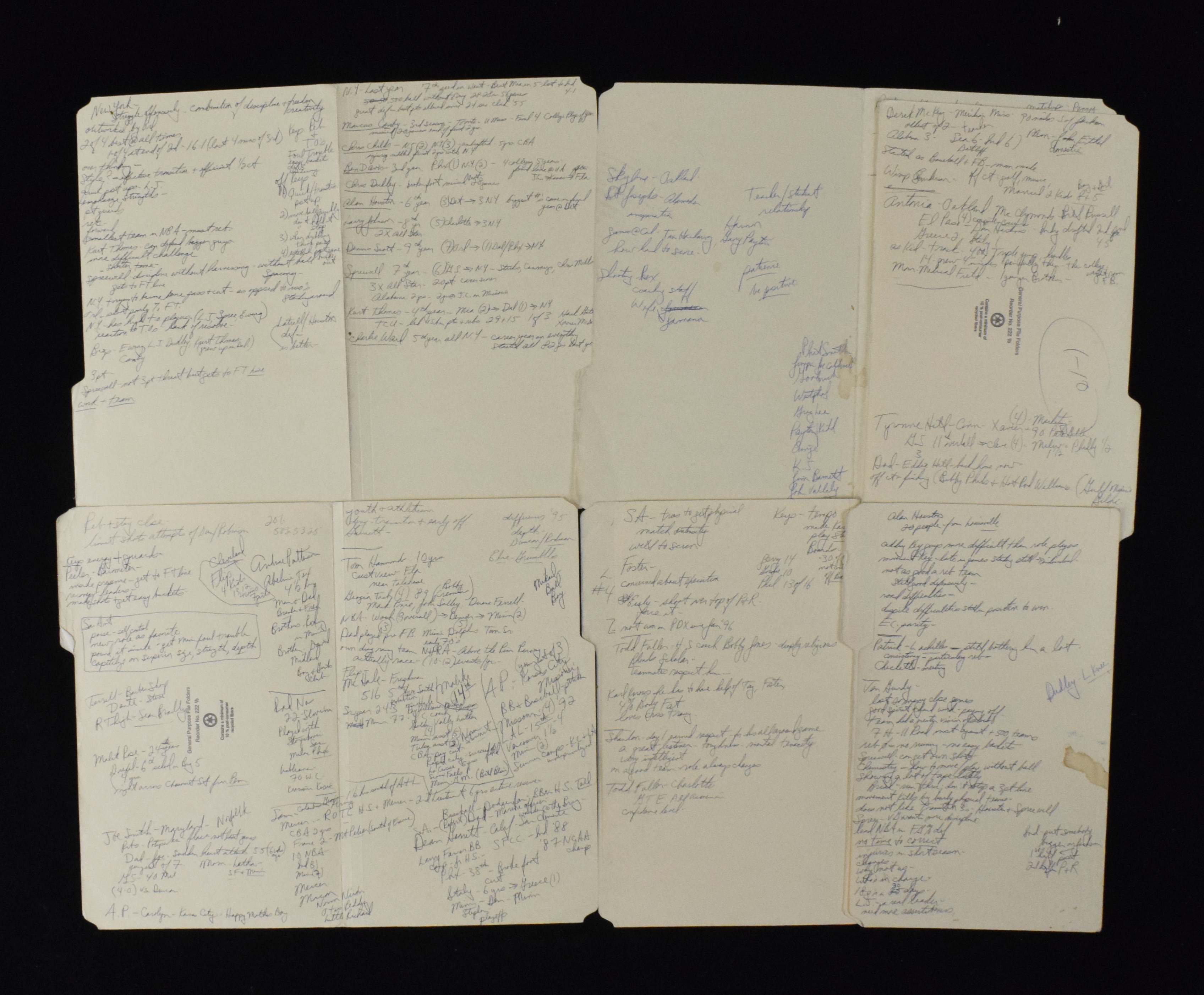 Description:Lot of Bill Walton handwritten NBA game notes (VG-EX/MT). Includes (10) 9.5"x14.5" folders/pages with Walton's broadcasting notes from various games. Walton mentions Tim Hardaway, Kobe Bryant, Shaquille O'Neal, Patrick Ewing, Chris Mullin, and others. Includes certificate of provenance from Walton Family: VG-EX/MT