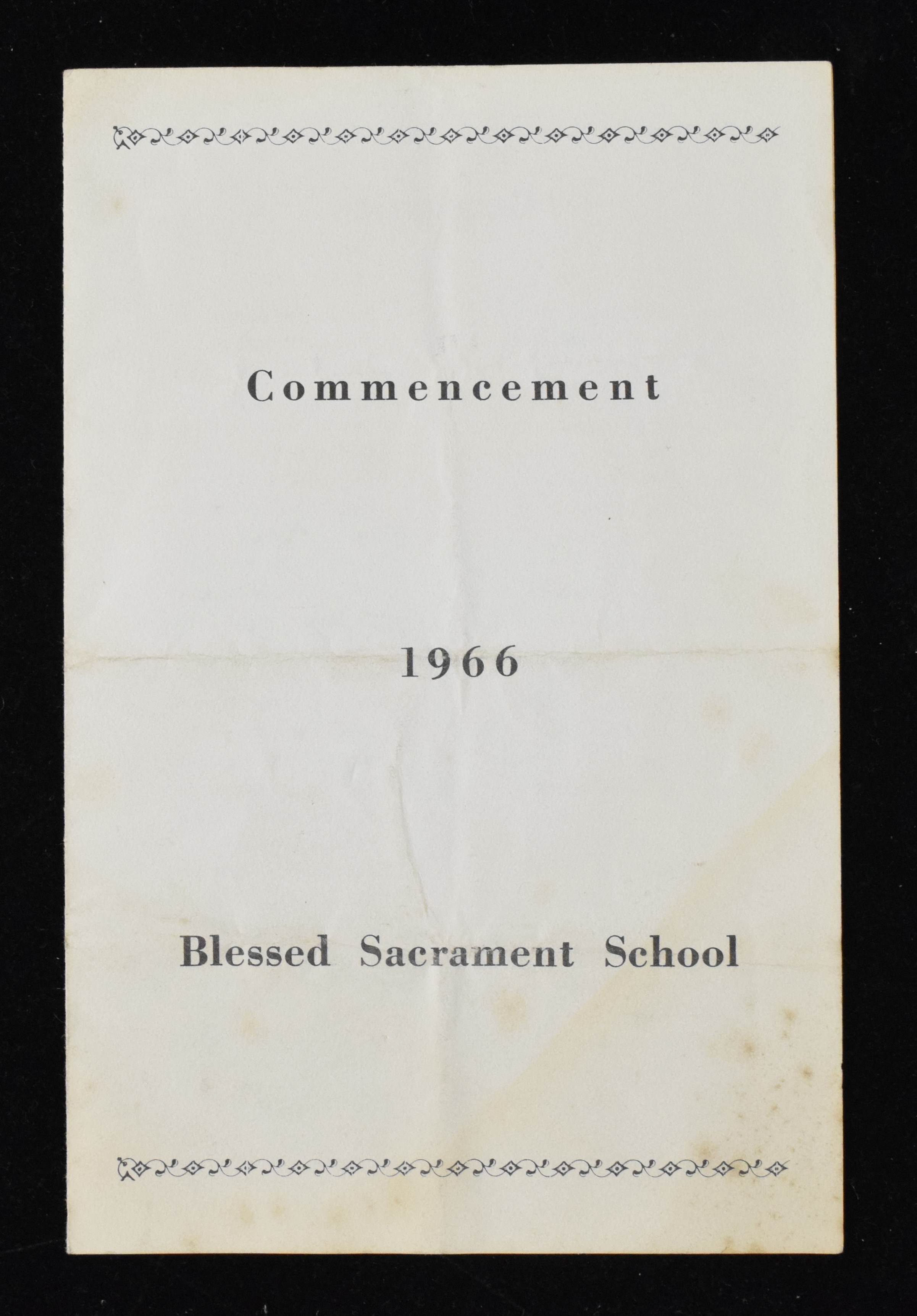 Description:Bill Walton's 1966 commencement program (VG). Fold-open bulletin from the Blessed Sacrament School commencement with the interior listing the graduates on one side (including William Theodore Walton), and the other side listing the program which includes an awards presentation that shows Walton as a recipient of a Scholastic Excellence award. Age/handling wear including fold crease. Includes certificate of provenance from Walton Family: VG