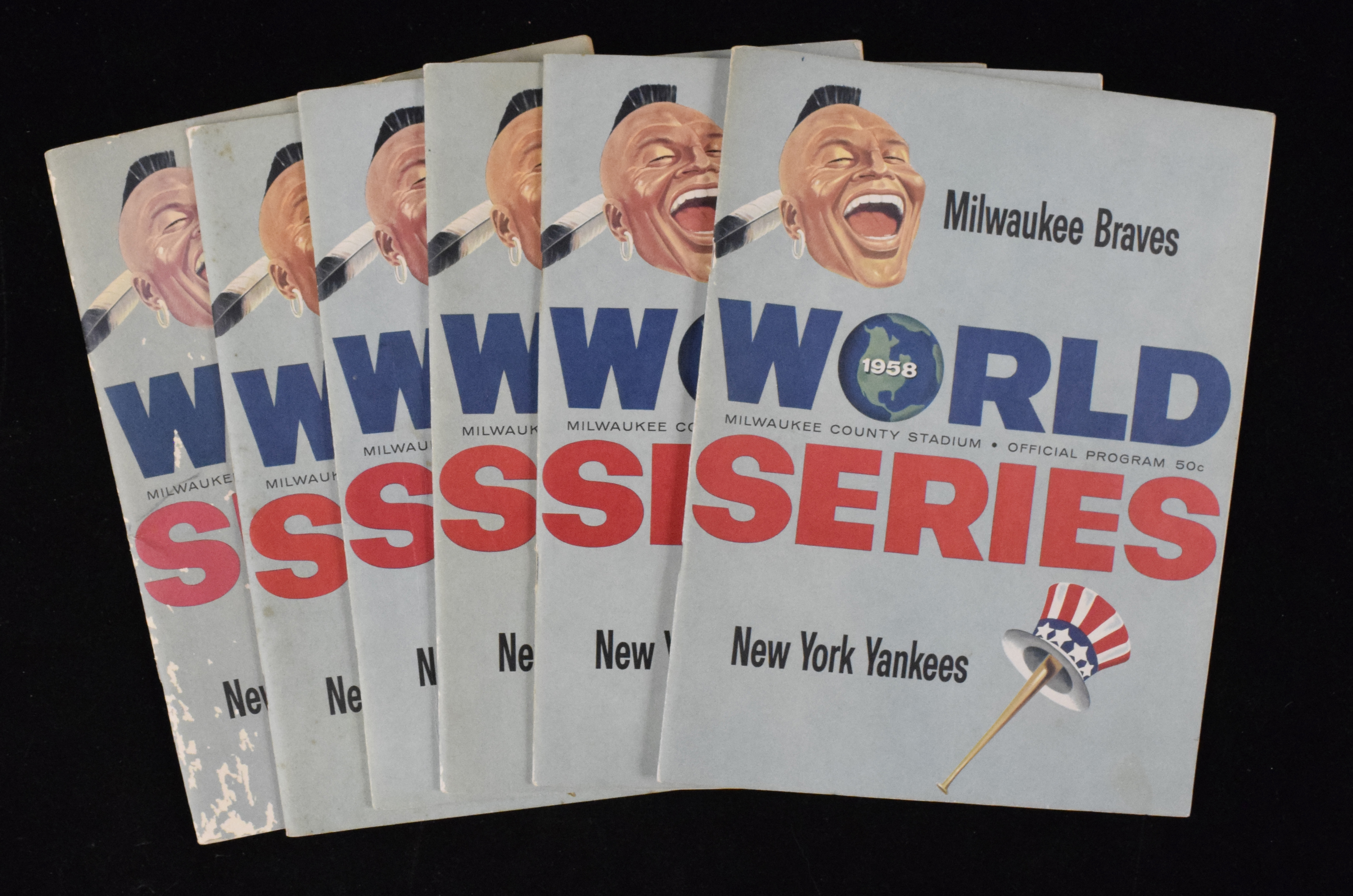Description:Lot of (6) 1958 World Series programs (FR/GD-EX/MT). All are Milwaukee County Stadium versions. Includes one with Game 1 lineups written but unscored (VG/EX-EX), one partially scored from Game 1 (VG-VG/EX), one with lineups written for Game 2 but unscored (VG-VG/EX), one scored from Game 7 (EX/MT), and (2) unscored (FR/GD and VG/EX).