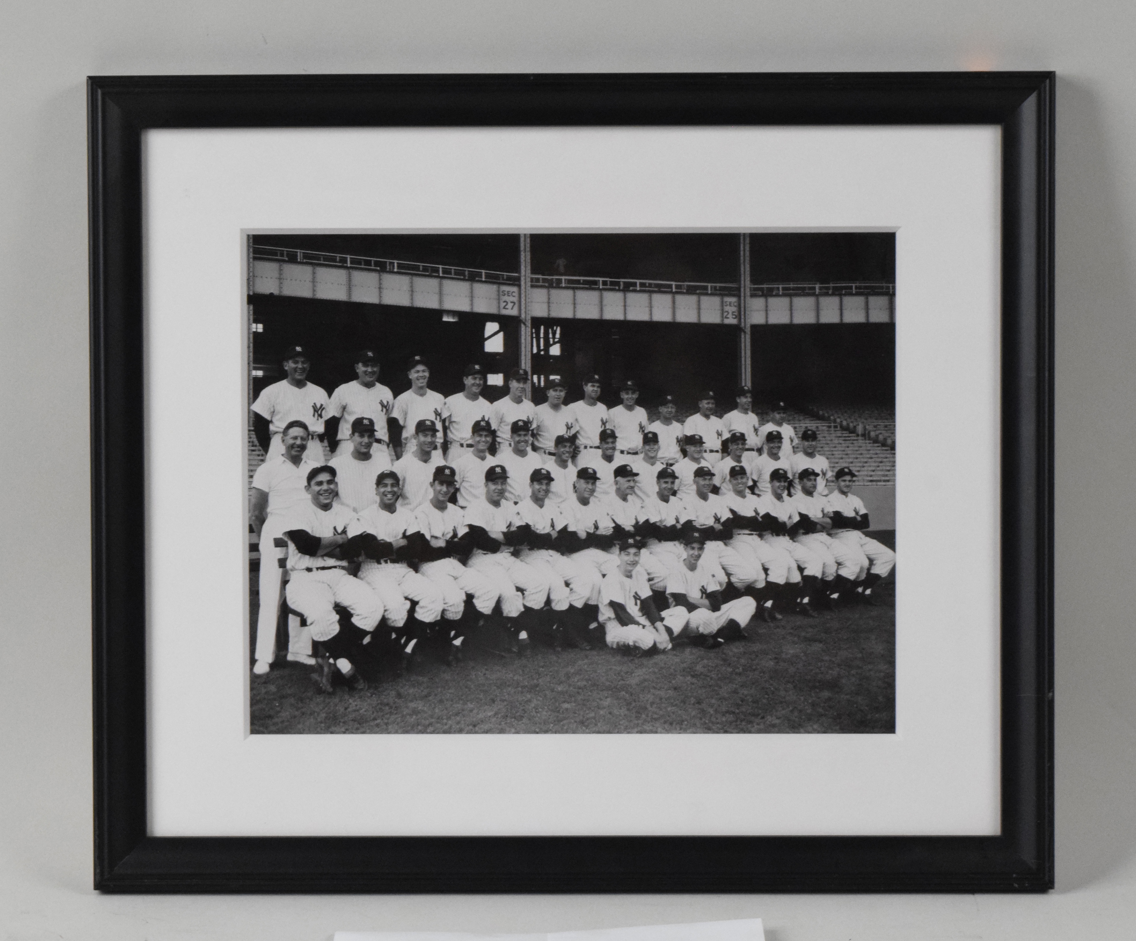 Description:1951 New York Yankees oversize team photograph (EX/MT framed). Frame measures approx. 16.5"x19.5" with 10"x13" visible image of the team including Joe DiMaggio in his final season and Mickey Mantle as a rookie. Due to framing, complete condition is unknown, but some minor surface crinkles are visible: EX/MT appearance ($500-$1,000)