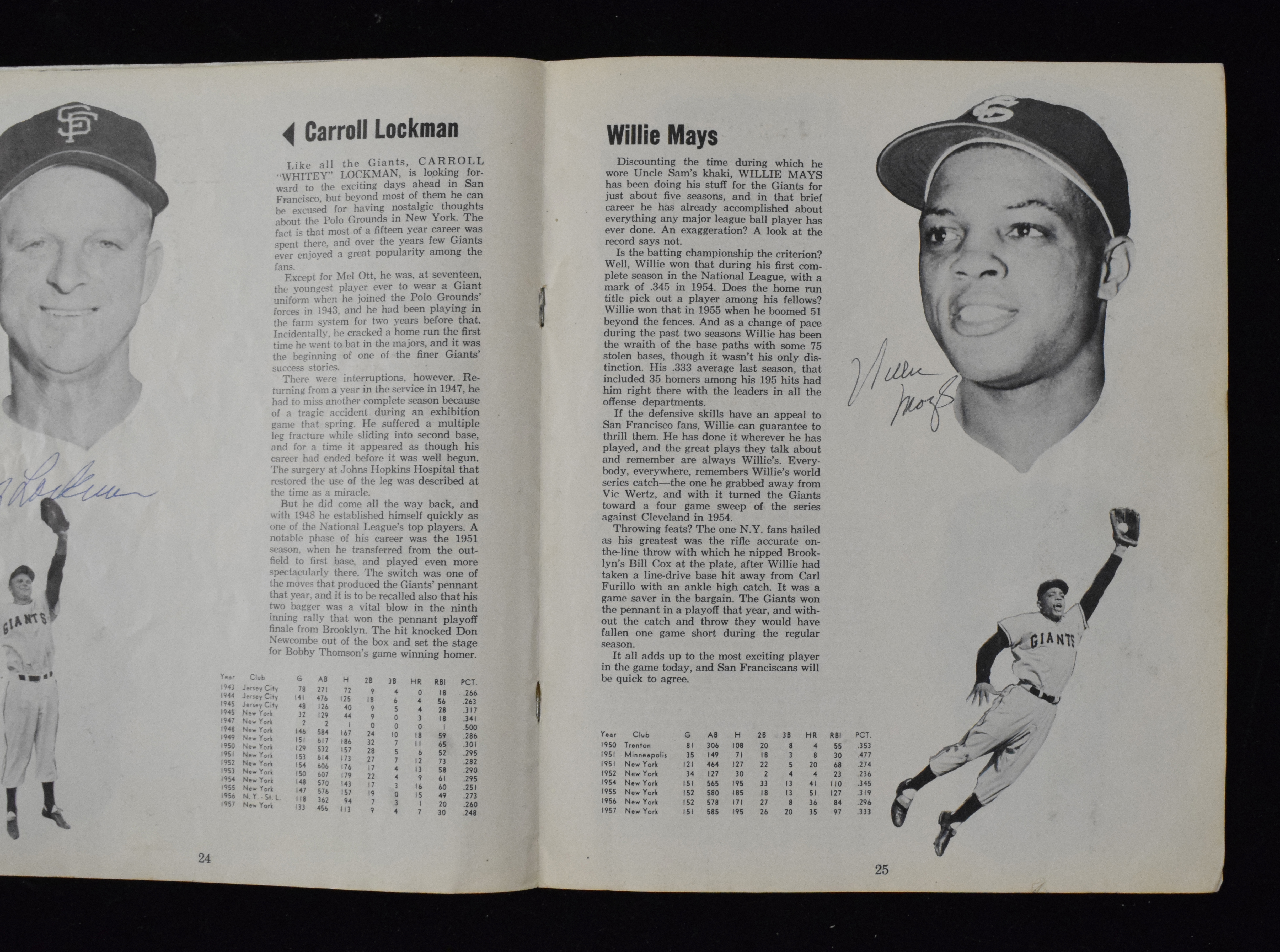Description:Multi-signed 1958 San Francisco Giants yearbook with (40) autographs including Hornsby & other HOFers - JSA (GD). Autographs include Carl Hubbell (signed twice), Rogers Hornsby, Stan Musial, Duke Snider, Willie Mays, Orlando Cepeda (rookie), Lefty O'Doul, Al Dark, Bob Friend, Mike McCormick, Bill Rigney, Horace Stoneham, Gus Suhr, Charles Feeney, Hank Sauer, Bob Thomson, Wes Westrum, Danny O'Connell, Johnny Antonelli, Pete Burnside, Ray Crone, Marv Grissom, Ray Jablonski, Ray Katt, Whitey Lockman, Bob Schmidt, Daryl Spencer, Valmy Thomas, Vinnie Smith, and others. Signatures rate 6/7 to 10 (avg 8) out of 10. Includes full LOA from JSA. Fairly heavy handling wear with taped spine: GD ($500-$1,000)