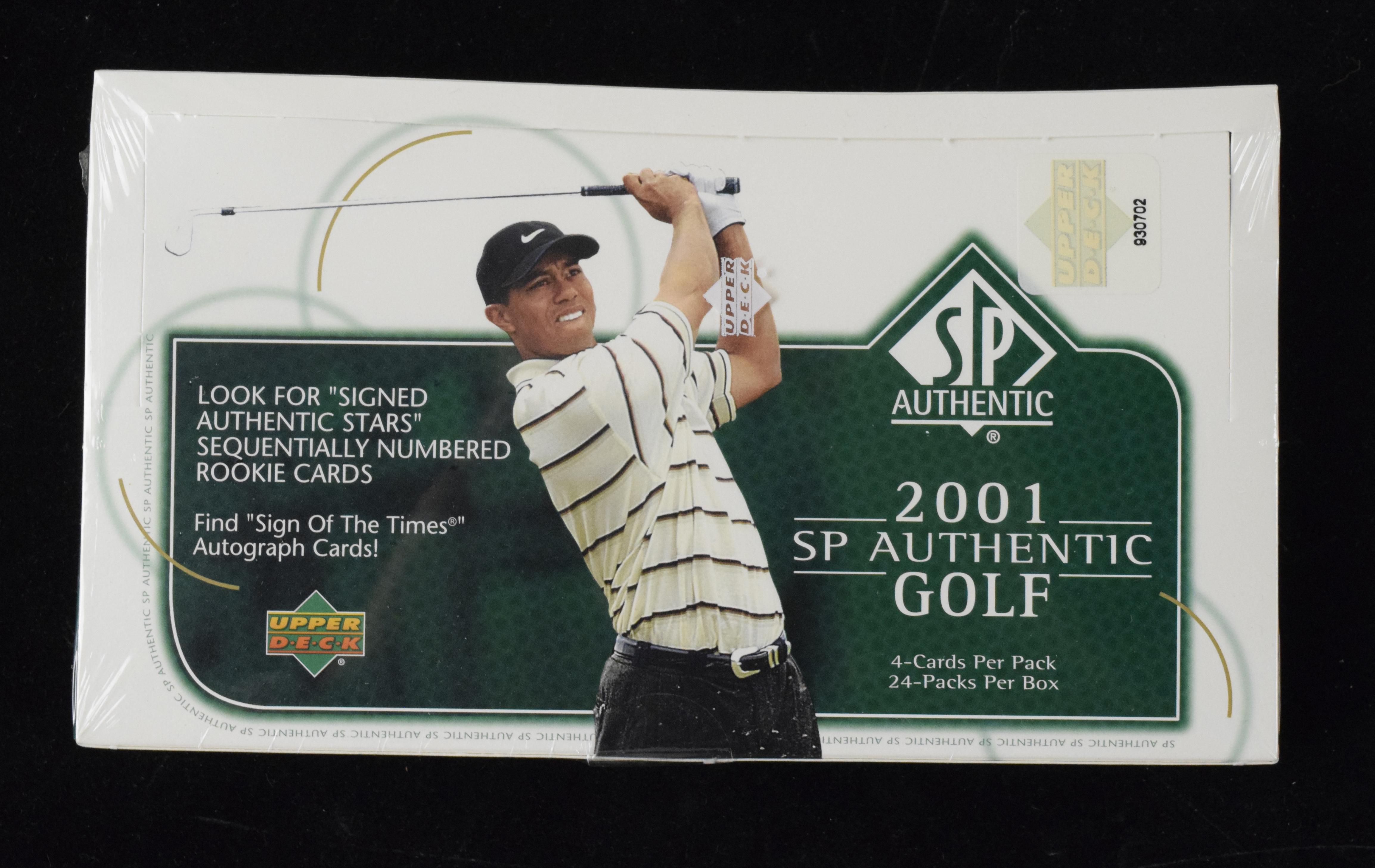 Description:2001 SP Authentic Golf sealed hobby box with (24) foil packs, Tiger Woods auto RC possible (Box: NM). Box remains factory-sealed in its original wrap from Upper Deck. Inside are (24) unopened foil packs of (4) cards each. Desirable packs offer a chance at the key autographed rookie card of superstar Tiger Woods, numbered to 900. Box has light shelf wear: NM. ($750-$1,250)