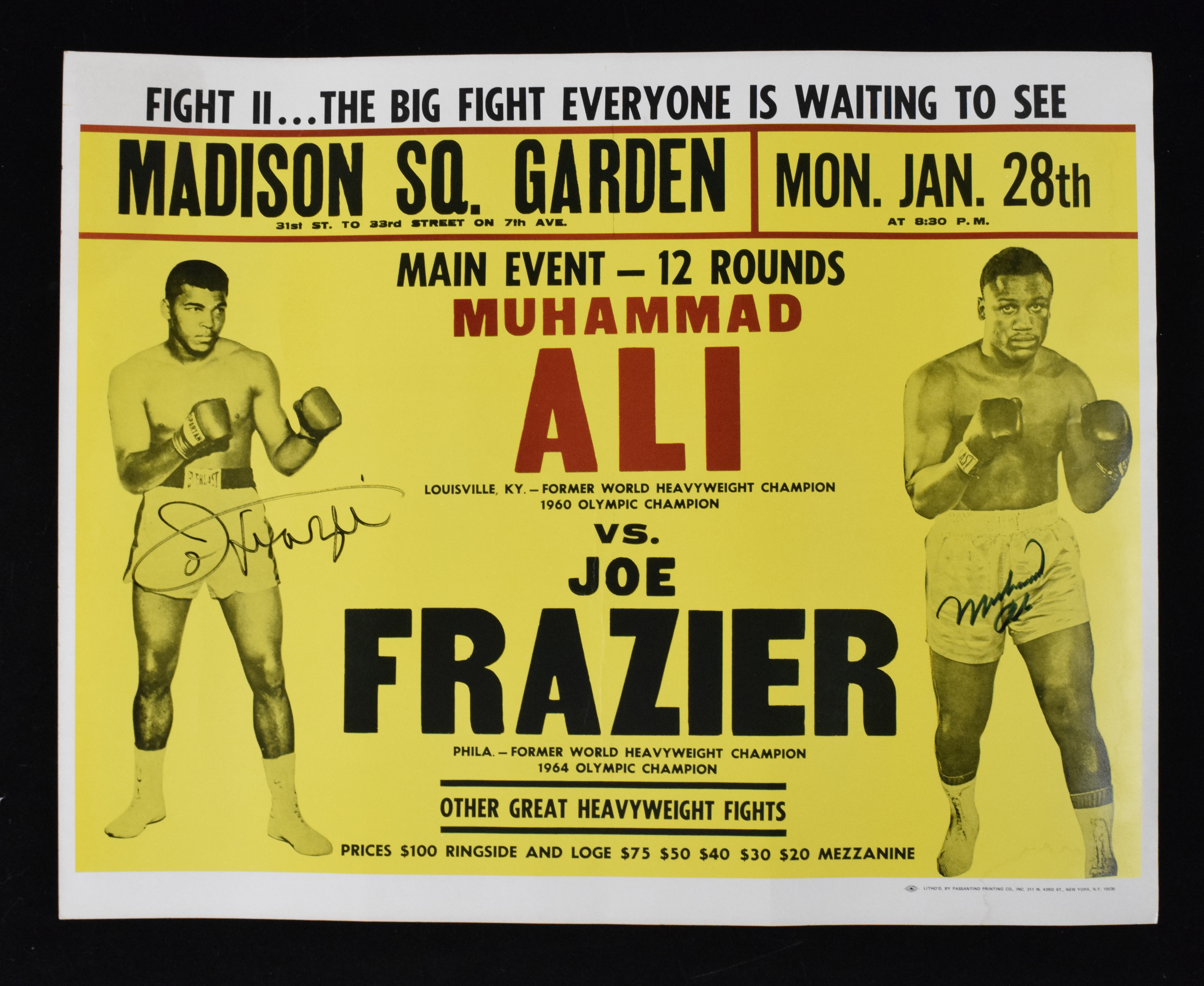 Description:Muhammad Ali vs. Joe Frazier autographed Fight II poster, Passantino Printing Co. (Sigs. NM-NM/MT; Poster: FR). Outstanding 23"x29" Fight II poster for the iconic 1974 heavyweight rematch between Muhammad Ali vs. Joe Frazier at Madison Square Garden has been signed in black marker by both boxers, except Ali signed over the image of Frazier and Frazier signed over the image of Ali. Poster is marked "Litho'd by Passantino Printing Co." of New York in the lower right margin. Signatures rate 7/8 out of 10. Poster has some light creasing through the center and moisture staining along the most of the right edge, with a small area of staining on the bottom edge. Back is heavily toned. Piece retains excellent eye appeal despite the technical grade: FR. ($1,000-$2,000)