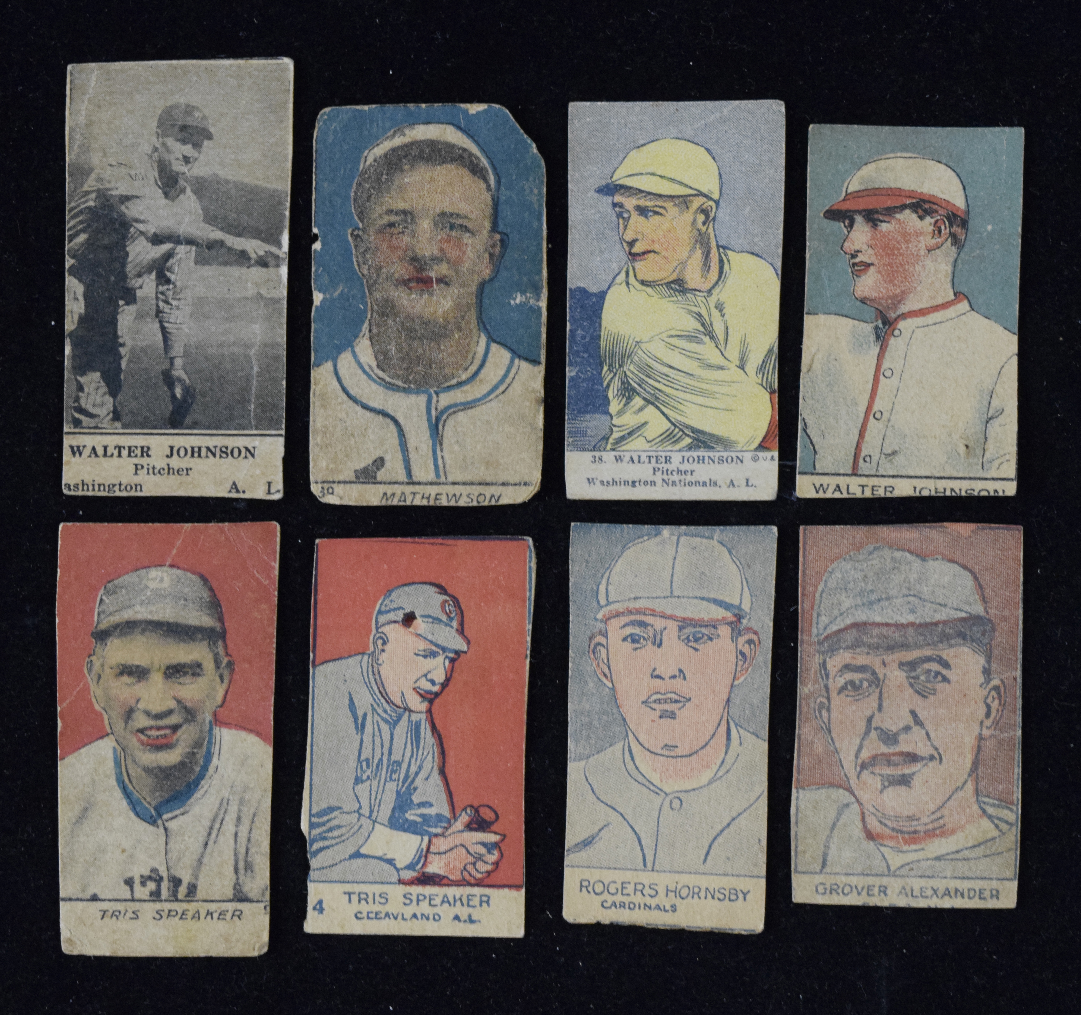 Description:Collection of (8) 1920s hand-cut HOFer strip cards with Mathewson, Johnson and Speaker (Authentic). Outstanding collection of original Hall of Famer strip cards are cut well within the borders, and some with slightly irregular cuts. Lot includes a sampling of cards from various issues, including 1920 W522, 1923 W515-1, 1920 W520 and 1925 W590. Includes (3) Walter Johnson, (1) Christy Mathewson, (1) Grover Cleveland Alexander, (1) Rogers Hornsby and (2) Tris Speaker. All grade Authentic due to severe cuts, though most have a GD-VG appearance. ($1,000-$2,000)