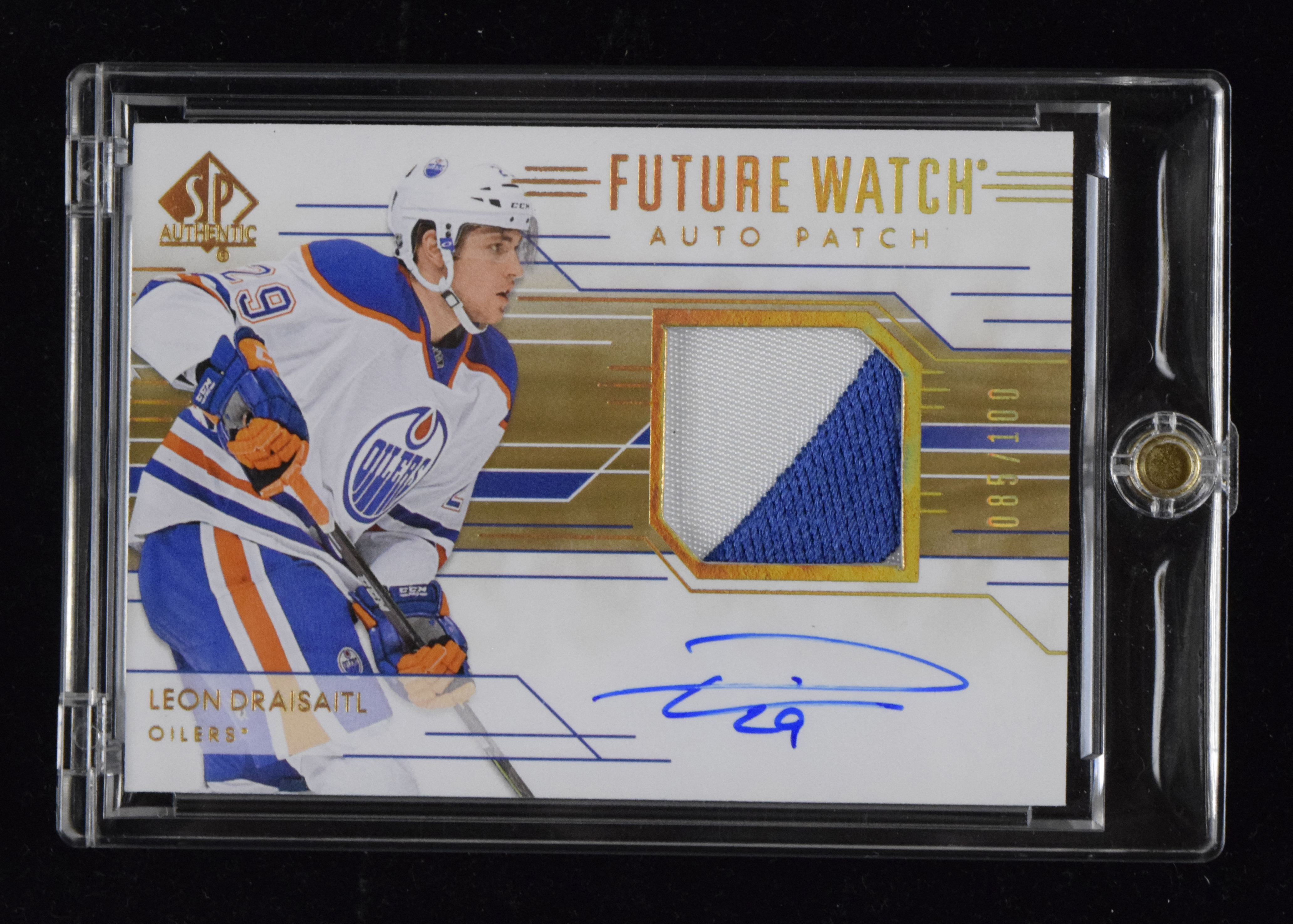 Description:Leon Draisaitl signed 2014-15 SP Authentic serial numbered rookie patch autograph insert card (NM). 2014-15 SP Authentic "Limited Auto Patches" #277 signed by Draisaitl in blue marker. Signature rates 8 out of 10. The card is #ed 85/100: NM ($750-$1,500)