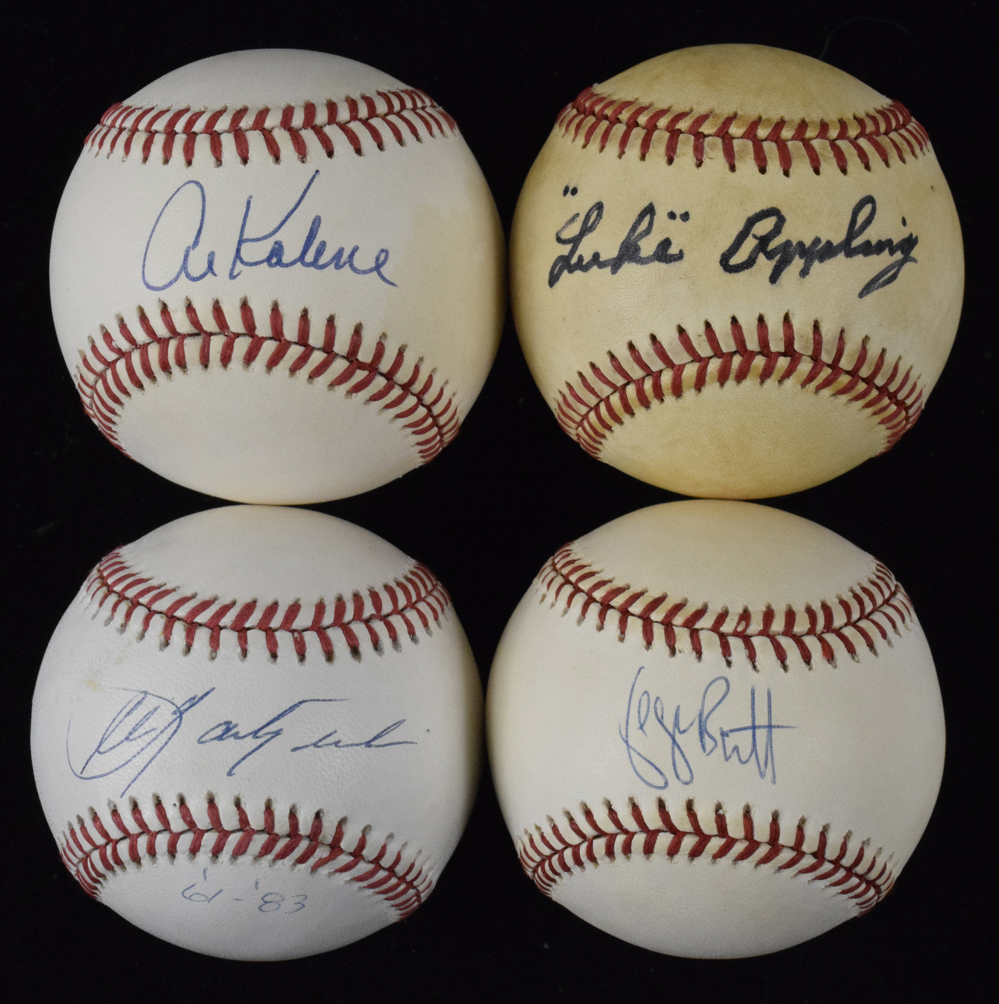 Description:"Lot of (4) batting title winners signed baseballs (VG/EX-EX/MT). Includes L.MacPhail AL ball signed by Luke Appling (PSA/DNA), B.Brown AL ball signed by Al Kaline, B.Brown AL ball signed by Carl Yastrzemski with ""'61-'83"" inscription (UDA), and B.Brown AL ball signed by George Brett. Signatures rate 8 to 9/10 out of 10. All have various degrees of toning (Appling most toned): VG/EX-EX/MT"