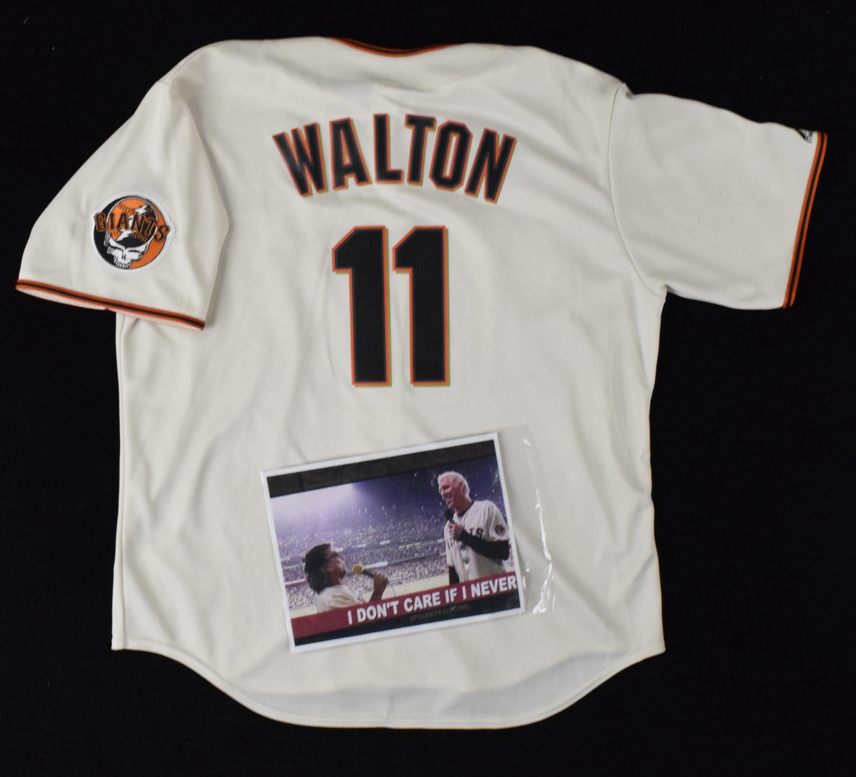 Description:Bill Walton's Grateful Dead style San Francisco Giants jersey with related photograph (EX). Majestic size XL Giants #11 "WALTON" jersey with Grateful Dead skull logo Giants patch on the left sleeve. Includes 8.5"x11" printed off photo picturing Walton wearing silimar/same jersey while singing "Take Me Out To The Ball Game" at a Giants game. Stains on the front of the jersey. certificate of provenance from Walton Family: EX