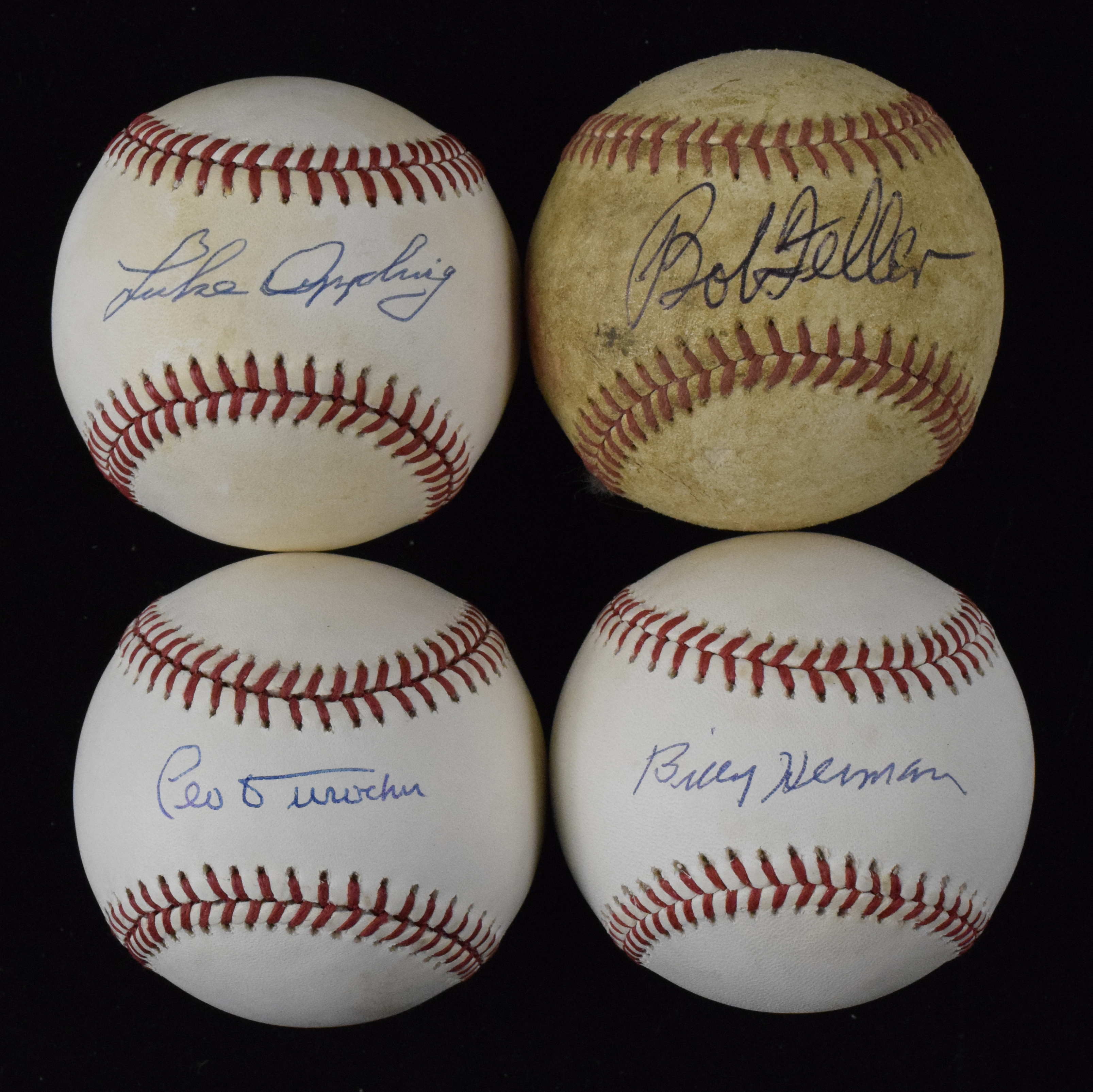 Description:"Lot of (5) HOFers signed baseballs (GD-EX/MT). Includes B.Brown AL ball (toning) signed by Luke Appling, heavily used ball signed by Bob Feller, W.White NL ball (light toning) signed by Billy Herman, W.White NL ball (light toning) signed by Leo Durocher, and B.Brown AL ball (toning) signed by Jim Palmer. Signatures rate 7/8 to 9/10 out of 10: GD-EX/MT"