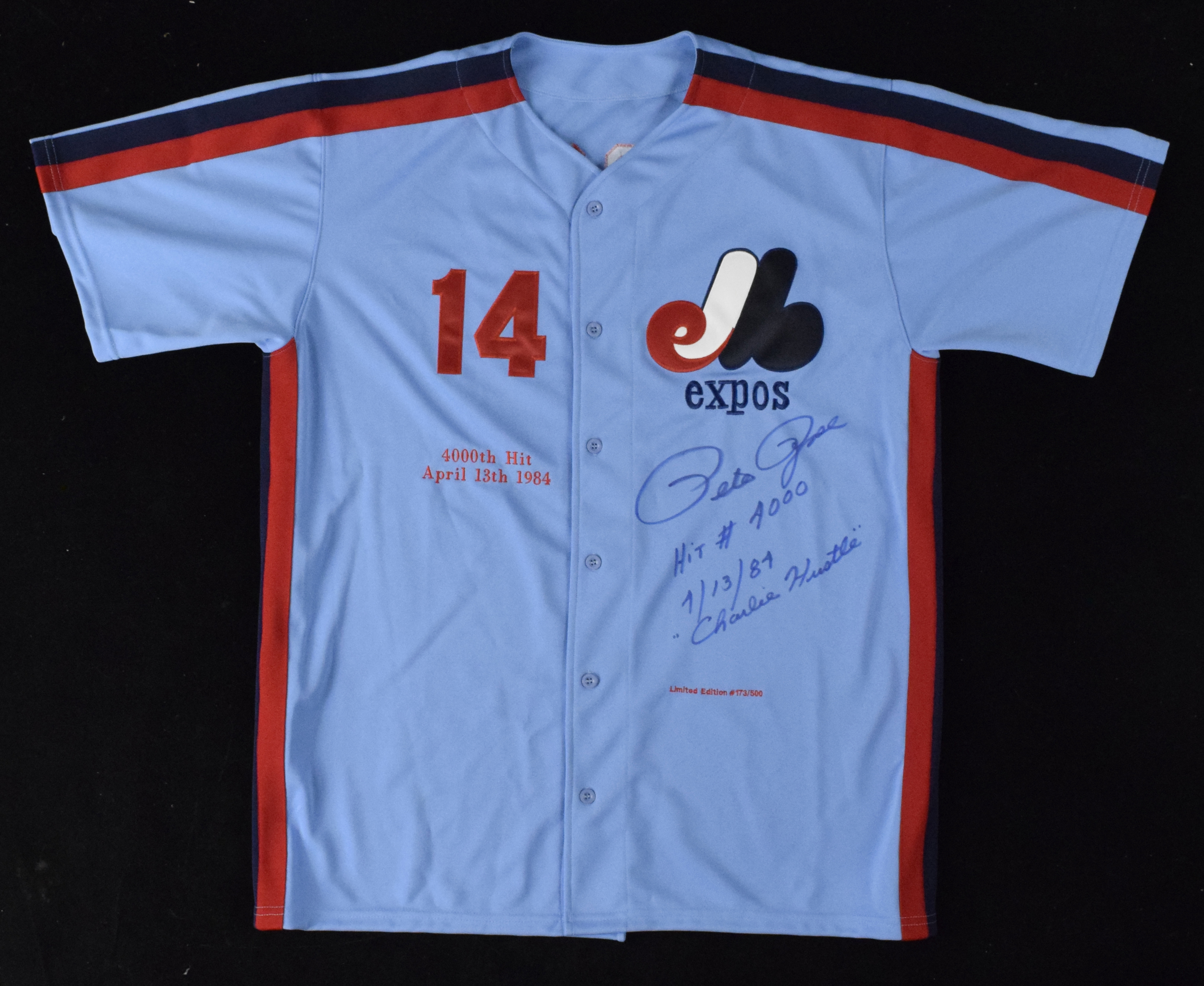 Description:"Pete Rose signed & inscribed limited edition Montreal Expos commemorative 4000th hit jersey (NM). Untagged powder blue Expos #14 Pete Rose jersey embroidered ""4000th Hit"" ""April 13th 1984"" and #ed 173/500. Rose signed the jersey in blue marker and added ""Hit #4000"" ""4/13/84"" ""Charlie Hustle"" inscriptions. Signature rates 8/9 out of 10: NM"