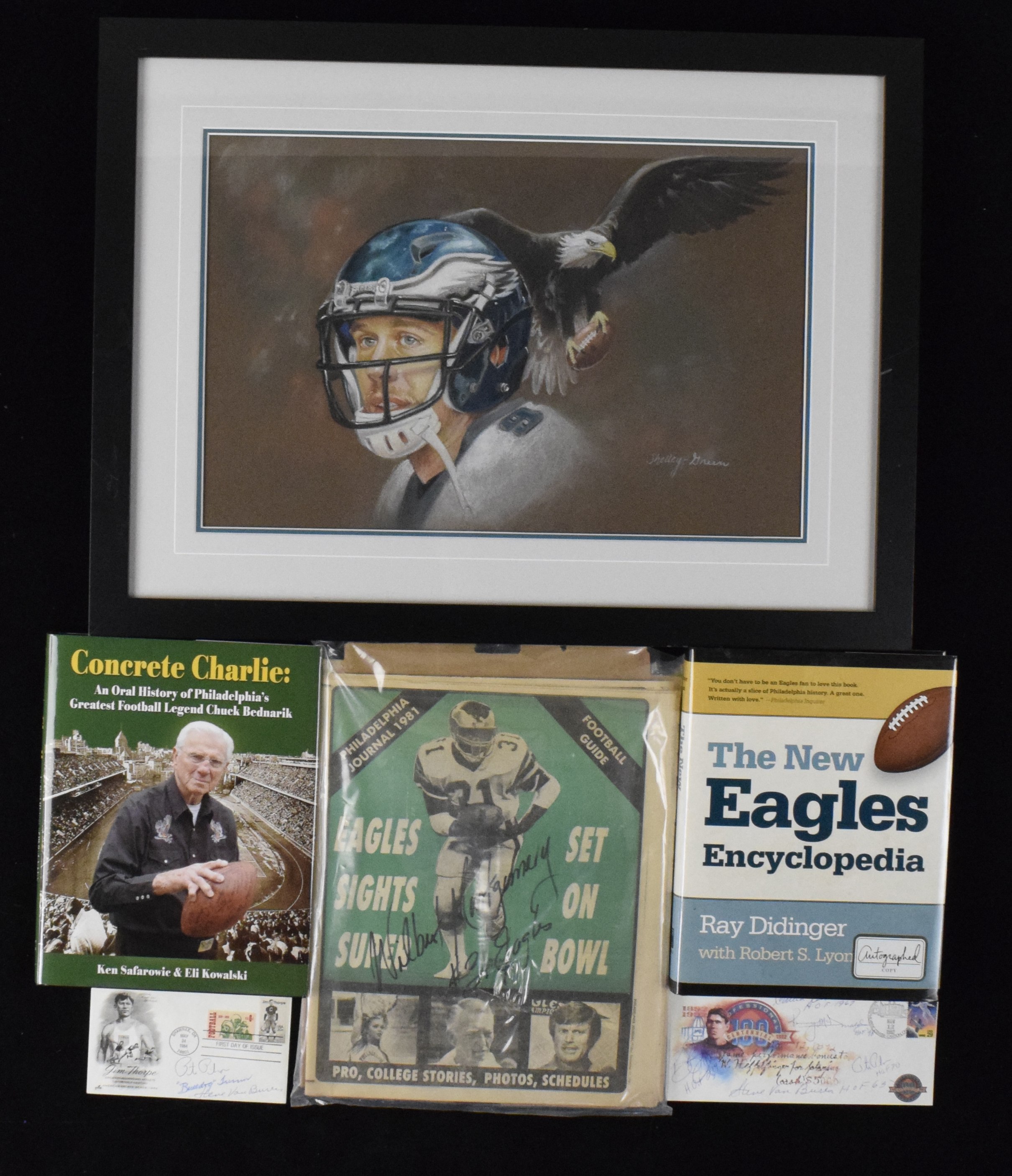 Description:"Lot of Philadelphia Eagles memorabilia and autographs (EX-NM/MT). Autographs include 1984 FDC envelope multi-signed by Steve Van Buren, Bulldog Turner, and Pete Pihos; 1992 FDC envelope signed by (5) Eagles HOFers: Chuck Bednarik, Tommy McDonald, Pete Pihos, Bob Brown, and Steve Van Buren with all adding their HOF inscription; 2009 ""Concrete Charlie"" hardcover book signed by Chuck Bednarik with ""Eagles 1949-62"" ""HOF 67"" inscriptions; (2) Football Guide newspapers signed by Wilbert Montgomery with ""#31 Eagles"" inscription added to both; 2006 ""Invincible"" hardcover book signed by Vince Papale; 2014 ""The New Eagles Encyclopedia"" signed by Ray Didinger; 2008 ""Looking Back: 75 Years Of Eagles History"" signed by Eli Kowalski; and 2018 ""Underdogs"" hardcover book signed by Zach Berman. Signatures rate 7 to 10 (avg 8/9) out of 10. Also includes 19.5""x26"" framed Nick Foles original artwork by Shelley-Green Studio, 9/8/2003 Tampa Bay Buccaneers at Eagles program from opener at Lincoln Financial Field, and Super Bowl XXXIX program. Various conditions throughout the lot. Most items appear to average EX/MT-NM overall. Range: EX-NM/MT"