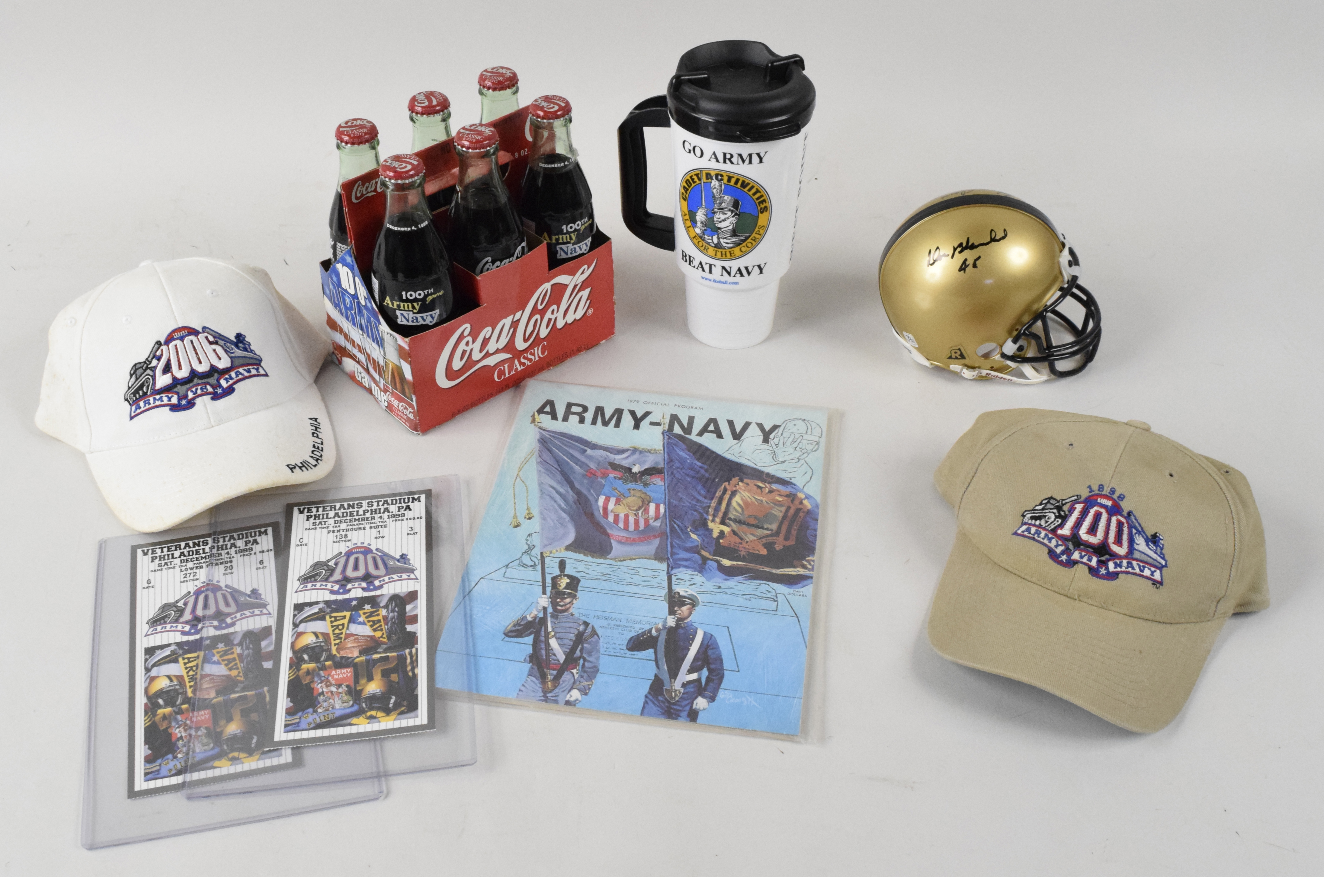 Description:"Lot of Army and Navy football memorabilia (VG-NM/MT). Includes an Army mini helmet dual-signed by Doc Blanchard and Glenn Davis; (6) Army vs Navy programs: 1979, 1994, (2) 1999 with (2) ticket stubs, 2001 with ticket stub, and 2006; 6-pack of unopened 12/4/1999 bottles of Coke commemorating the 100th Army vs Navy game; Army thermos; and (2) worn hats. Most items appear to average EX/MT-NM overall. Range: VG-NM/MT"