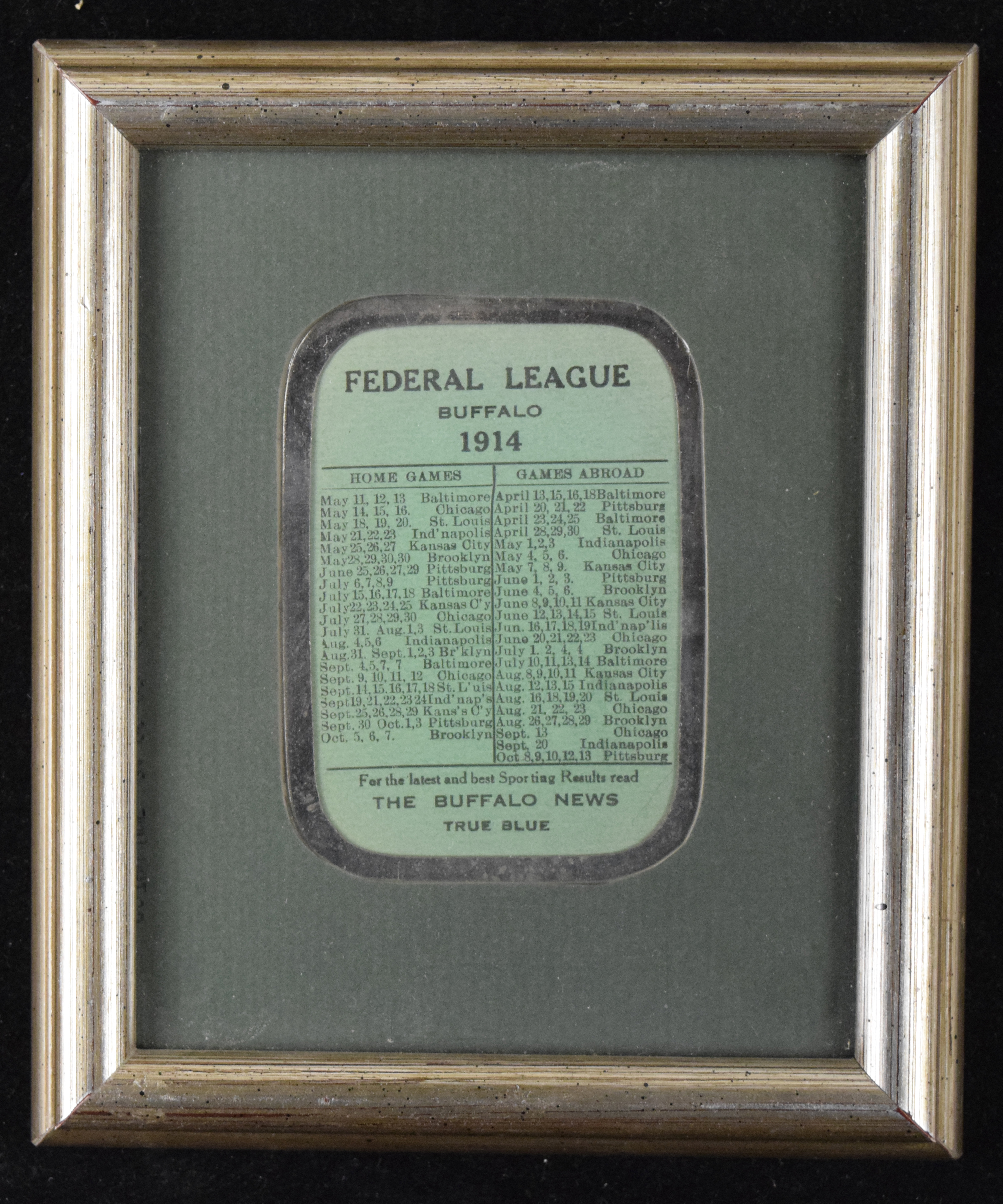 Description:"Buffalo Buffeds & Buffalo Bisons 1914 Federal League & International League pocket schedule (NM framed). Frame measures approx. 5.5""x6.5"" and contains a pocket schedule showing the 1914 home & road games for the Buffeds on one side and the home & road games for the Bisons on the other side. The frame is clear on the front and back so that both sides can be seen. Due to framing, complete condition is unknown: NM appearance"