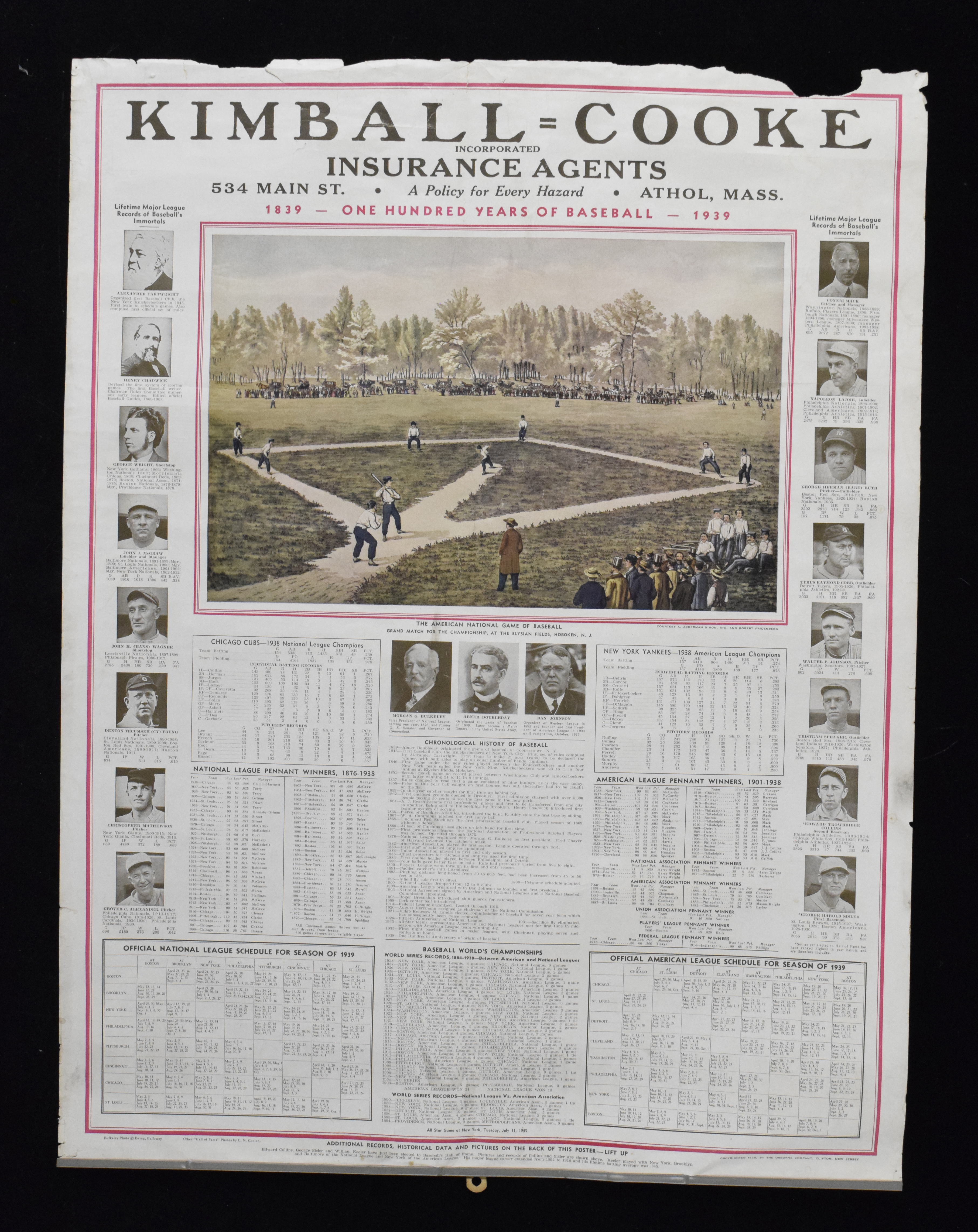 Description:"1939 One Hundred Years Of Baseball advertising poster (VG). Approx. 21""x27.5"" Kimball-Cooke Insurance Agents poster with front and back chronicling the history of baseball and various star players up to 1939. Wear around the edges including chips along the top: VG"