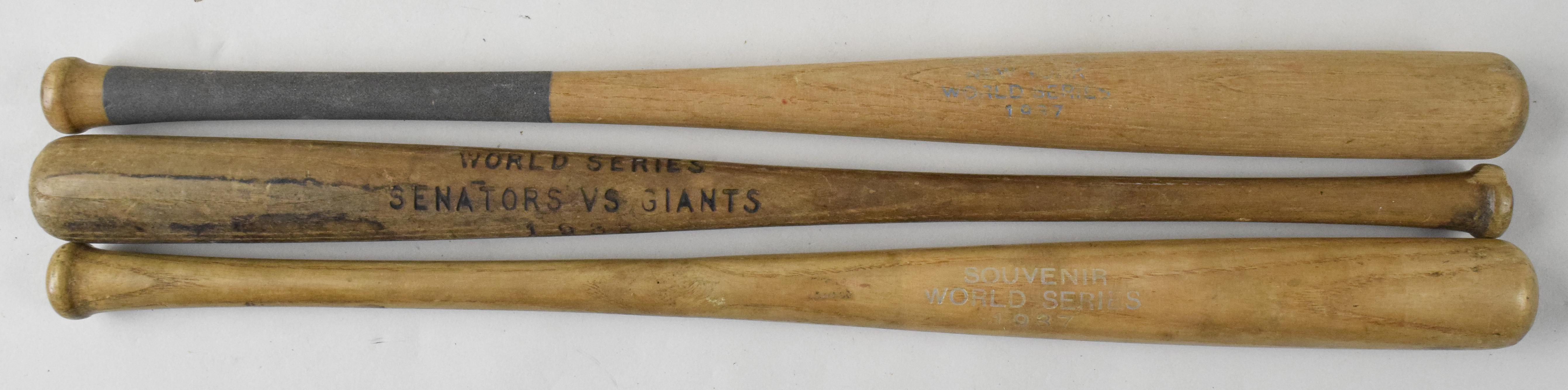 Description:"1933 and (2) different 1937 World Series mini bats (VG-EX). Includes 18"" Washington Senators vs New York Giants 1933 World Series mini bat (VG), 18"" ""Souvenir World Series 1937"" mini bat (EX), and 18"" ""Souvenir Of New York World Series 1937"" mini bat (VG/EX)."