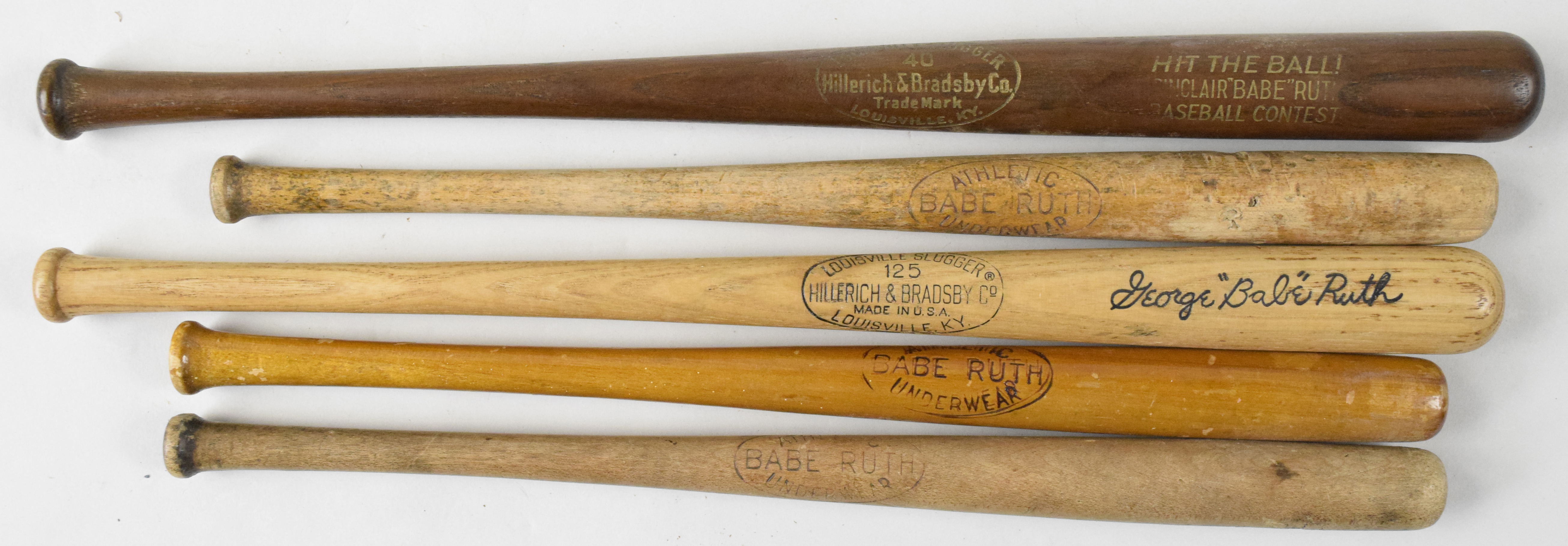Description:"Lot of (5) vintage Babe Ruth mini bats, c.late 1920s-60s (FR/GD-EX/MT). Includes (3) c.late 1920s 14"" Babe Ruth Athletic Underwear mini bats (FR/GD-GD-VG), 16"" c.1937 Louisville Slugger ""Sinclair Babe Ruth Baseball Contest"" mini bat (VG/EX), and c.mid-late 1960s 16"" Louisville Slugger 125 Babe Ruth mini bat (EX/MT)."