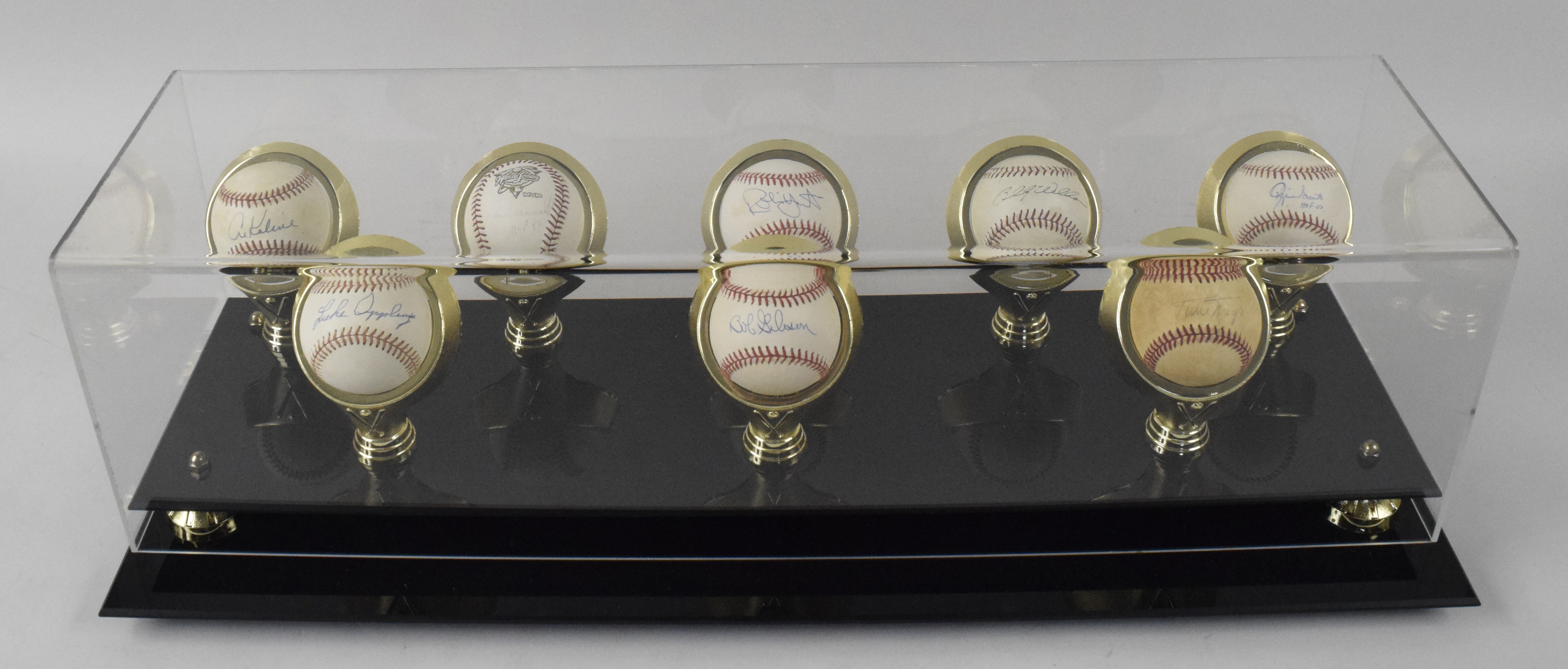 Description:"Lot of (8) HOFer single-signed baseballs in nice display case, including Mays, Gibson and Appling (Sigs. EX-MT). Nice lot of Hall of Famer single-signed baseballs, which are housed in an attractive 29""x9""x10"" plastic display case. Includes (1) C. Feeney N.L. ball signed by Willie Mays (ball heavily toned); (2) L. Coleman N.L. balls, signed by Ozzie Smith with ""HOF 02"" inscription (MLB Authentication sticker affixed) and Bob Gibson; (2) L. MacPhail A.L. balls signed by Luke Appling and Al Kaline; (1) B. Selig 2000 World Series ball signed by Alan Trammell with ""WS MVP 84"" inscription; (1) G. Budig A.L. ball signed by Robin Yount and (1) Wilson Ron Santo All-Star model ball signed by Billy Williams. Signatures range from 5 (Trammell) to 9 (avg. 7/8) out of 10, and balls have light to heavy toning: GD-NM. "
