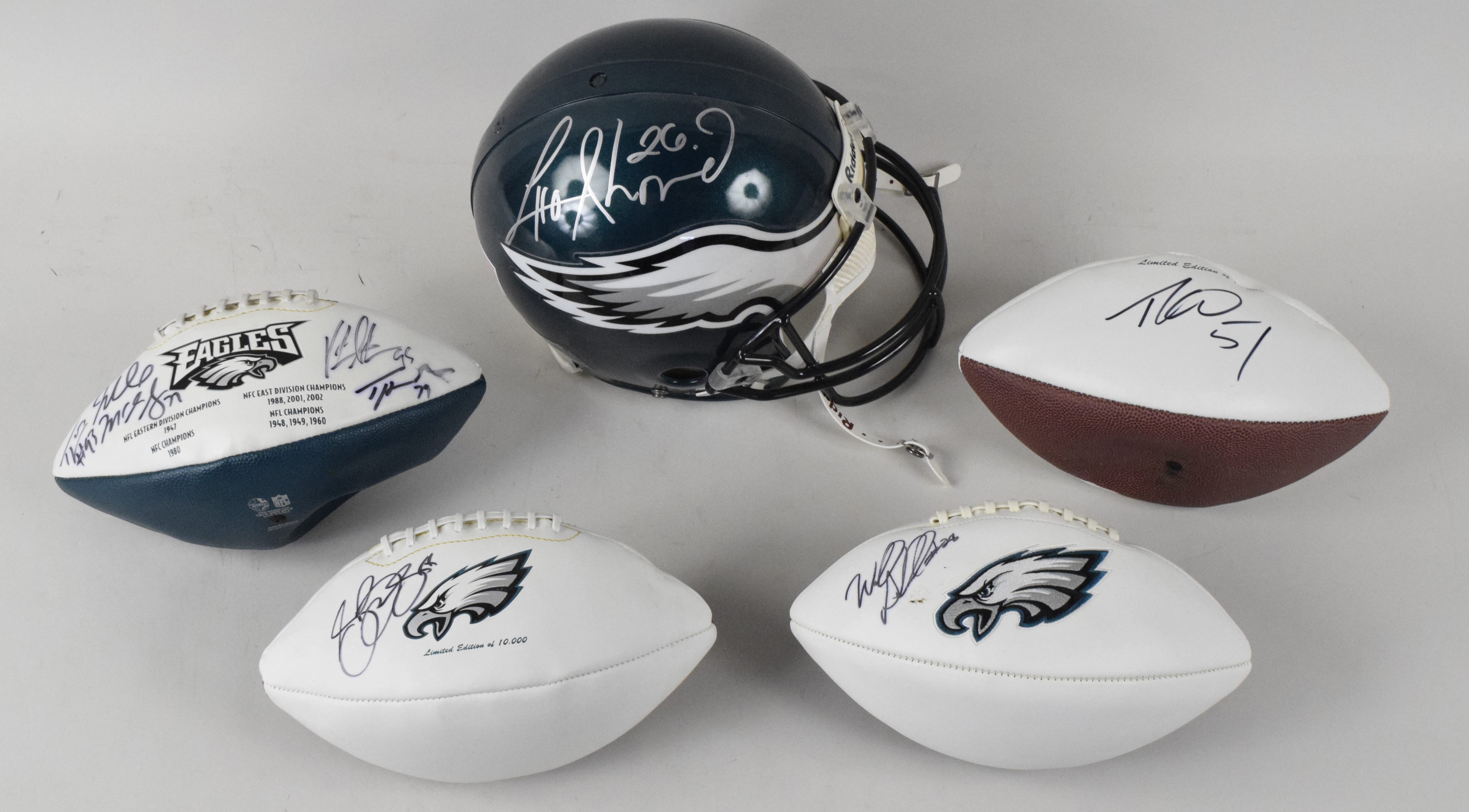 Description:"Lot of (5) Eagles signed items, including footballs and Lito Shepherd Lito Sheppard VSR-4 helmet (Sigs. VG/EX-MT). Lot includes (1) Riddell VSR-R Philadelphia Eagles helmet with applied #26 on the back and signed by Lito Sheppard; (1) Eagles logo white panel football signed by Wendell Smallwood (JSA Witnessed sticker affixed); (1) Eagles logo white panel football (in original box) signed by Stewart Bradley; (1) Eagles logo white panel football signed by Jon Dorenbos, Mychal Kendricks, Mike McGlynn and two others; and (1) Eagles logo white panel football signed by Takeo Spikes. Signatures range from 4 to 9 out of 10 (avg. 7/8). Footballs are mostly deflated (VG-VG/EX; unknown if will hold additional air). Helmet: NM. "