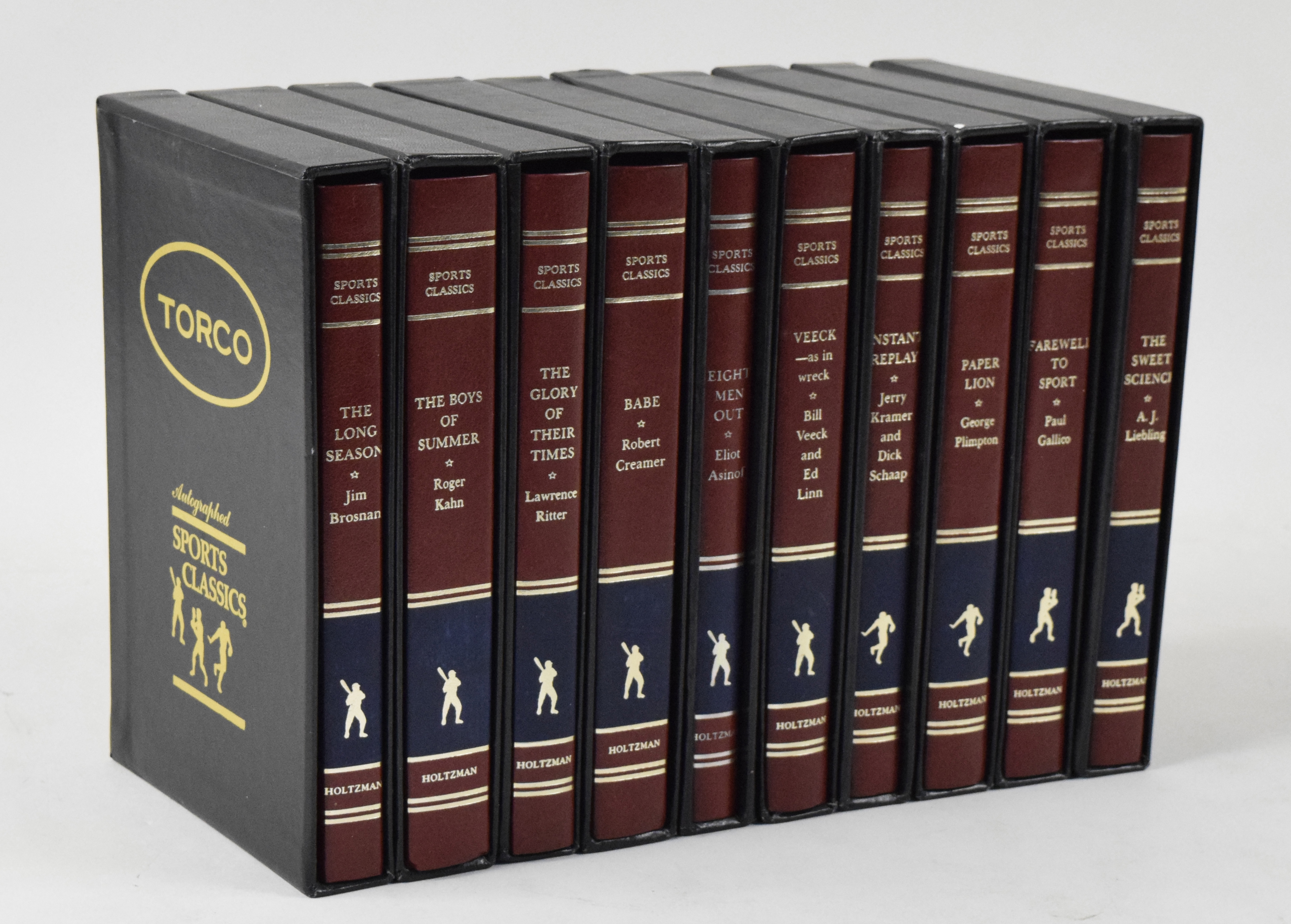Description:"Lot of (8) hardcover Holtzman Press Autographed Sports Classics books with slipcases, plus extra books (NM/MT). High-quality lot of (8) author-autographed hardcover books published by Holtzman Press, with (1) ""Paper Lion,"" signed on an interior page by George Plimpton; (1) ""Instant Replay,"" signed on an interior page by Jerry Kramer; (1) ""The Long Season,"" signed on an interior page by Jim Brosnan; (1) ""The Boys of Summer,"" signed on an interior page by Roger Kahn; (1) ""Babe,"" signed on an interior page by Robert Creamer; (1) ""The Glory of Their Times,"" signed on an interior page by Larry Ritter; (1) ""Eight Men Out,"" signed on an interior page by Eliot Asinof; and (1) ""Veeck as in Wreck,"" signed on an interior page by Bill Veeck. Also includes (2) books in the series with printed/facsimile signatures on interior pages: ""Farewell to Sport,"" by Paul Gallico and ""The Sweet Science,"" by A.J. Liebling. Each book is housed in a high-quality Torco slipcase. Signatures rate 9 out of 10, and books appear NM/MT. "