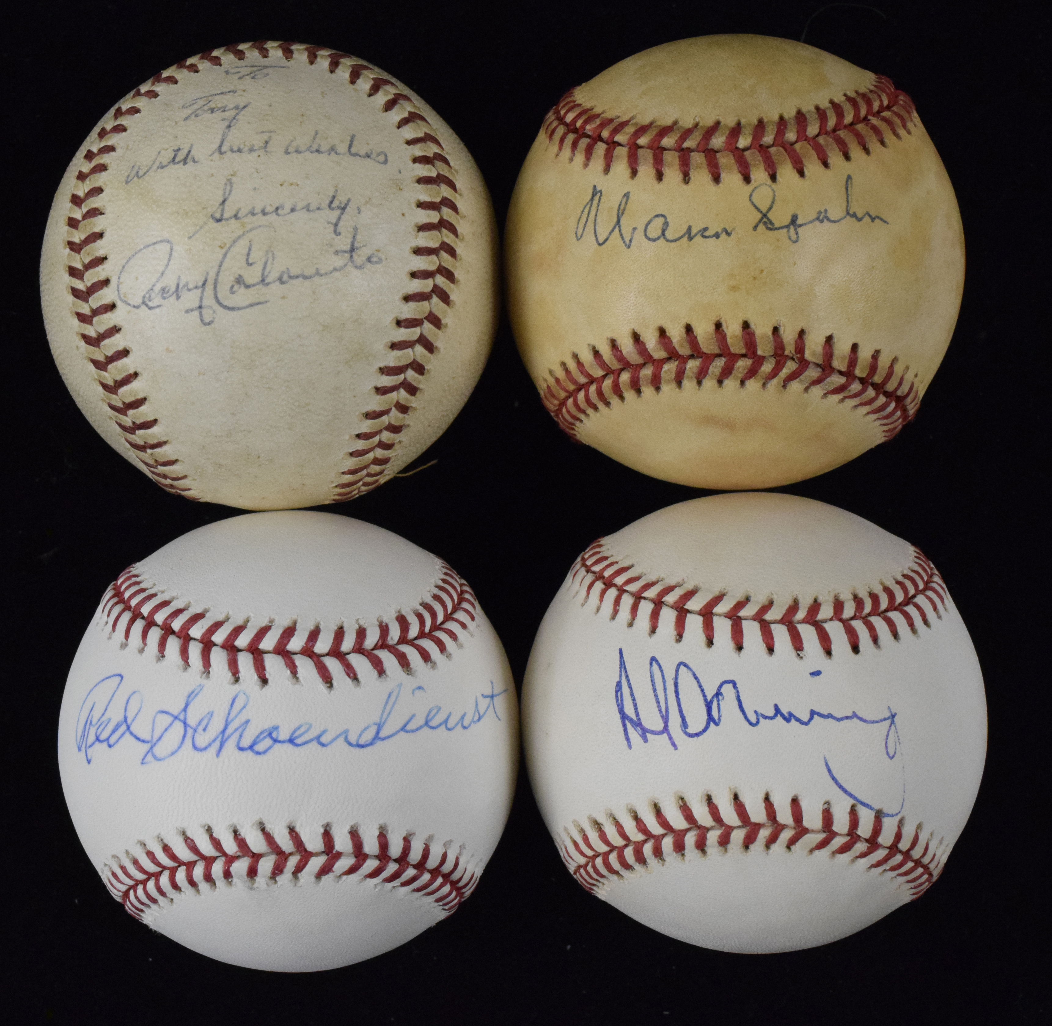 Description:"Lot of (8) autographed baseballs, including Spahn, Colavito and Schoendienst (Sigs. EX/MT-MT). Lot includes (1) Spalding W. Giles N.L. ball signed by George Shuba (personalized); (1) vintage ball with faded stampings signed by Bill Skowron; (1) Reach J. Cronin A.L. ball signed by Rocky Colavito (personalized); (1) L. Coleman N.L. ball signed by Warren Spahn; (1) B. Selig MLB ball signed by Red Schoendienst (PSA/DNA encapsulated with 10 auto and ball grade); (1) B. Selig MLB ball signed by Ray Fosse with ""73-74 WS Champs"" inscription (MLB authentication sticker affixed); (1) G. Budig A.L. ball signed by Al Downing and (1) B. Selig MLB ball signed by Gene Alley. Signatures range from 6 to 9 (avg. 7/8) out of 10, and balls have light to heavy toning: FR-NM/MT. "