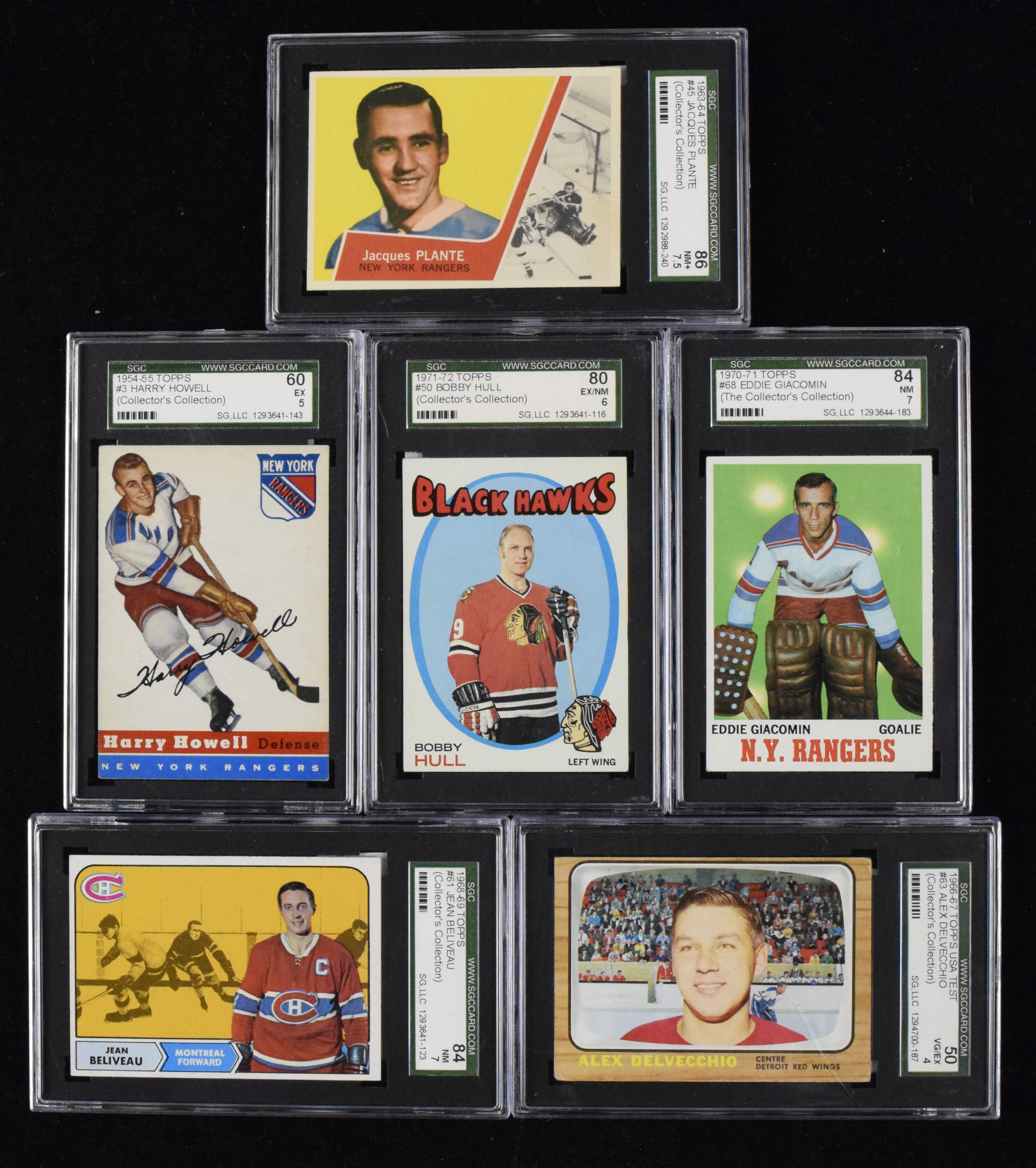 Description:"Lot of (15) SGC-graded 1954-1972 Topps hockey cards with Delvecchio, Plante & Hull (SGC 3 VG - SGC 7.5 NM+). High-value lot of Topps hockey cards, with each graded by SGC (large price stickers are affixed to the back of each holder). Includes (2) 1954-55 Topps: #s 4 Johnny Wilson (SGC 5 EX) and 3 Harry Howell (SGC 5 EX), (3) 1966-67 Topps USA Test: #s 63 Alex Delvecchio (SGC 4 VG/EX), 44 Ken Wharram (SGC 3.5 VG+) and 42 Red Kelly (SGC 3 VG); (1) 1968-69 Topps: #61 Jean Beliveau (SGC 7 NM) (1) 1963-64 Topps: #45 Jacques Plante (SGC 7.5 NM+) (7) 1970-71 Topps: #s 51 Serge Savard (SGC 6 EX/MT), (2) 49 Rogatien Vachon (SGC 7.5 NM+ and 5.5 EX+), (2) 35 Eddie Shack (SGC 5.5 EX+ and SGC 6 EX/MT), 68 Eddie Giacomin (SGC 7 NM) and 57 Jacques Lemaire (SGC 7 NM) and (1) 1971-72 Topps #50 Bobby Hull (SGC 6 EX/MT). Range: SGC 3 VG - SGC 7.5 NM+ (with note on price stickers affixed to the reverse of each). "