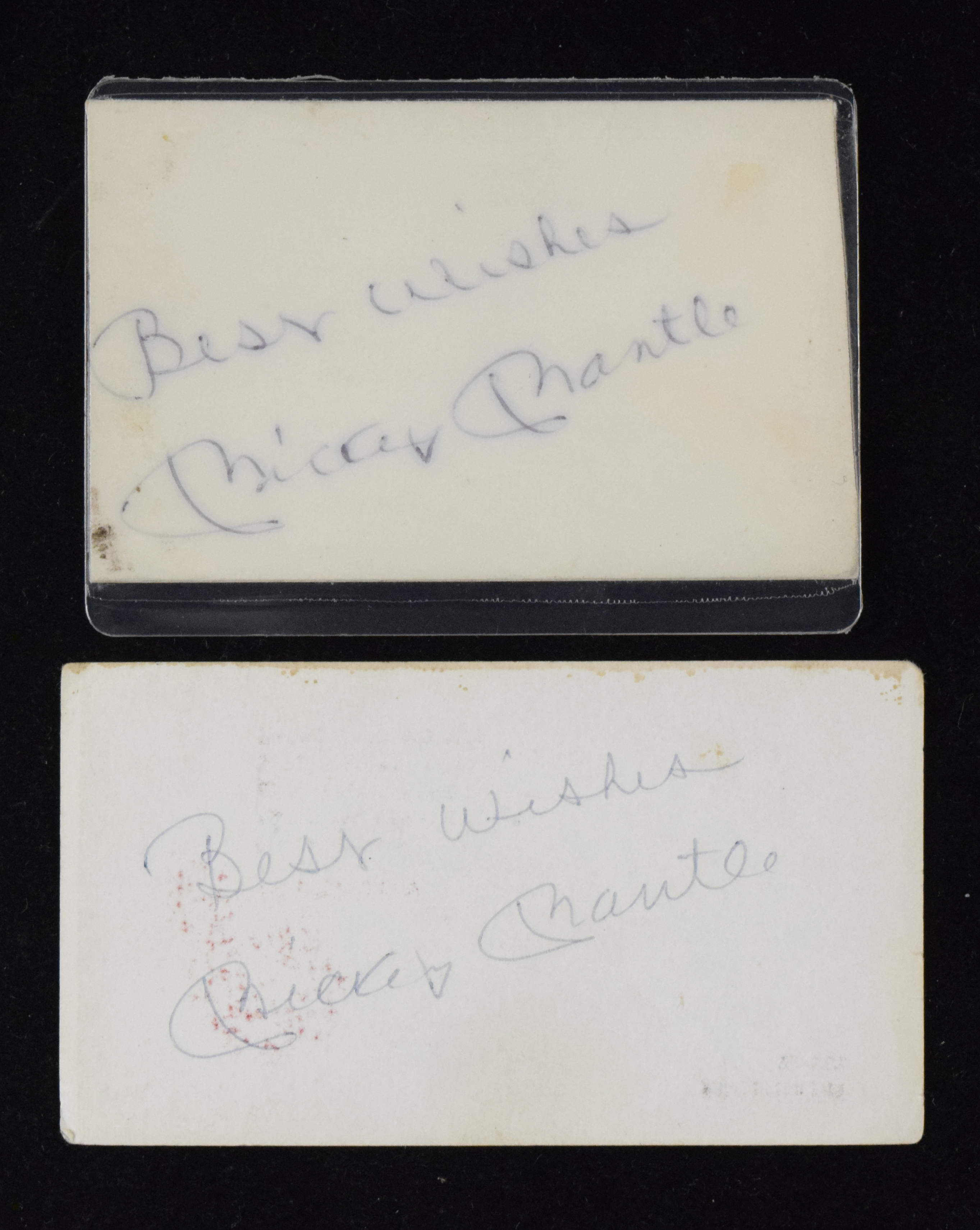 Description:"Lot of (3) autographed business cards, with (2) Mickey Mantle and (1) Willie Mays (Sigs. EX/MT-NM). Lot includes (1) Phillies business card signed on the blank reverse by Mickey Mantle inscription and (2) business cards trimmed and laminated back-to-back, with each signed on the blank reverse by Mickey Mantle and Willie Mays. All three have ""Best Wishes"" inscriptions. Signatures rate 6/7 out of 10, and cards appear VG, with two laminated/trimmed. "