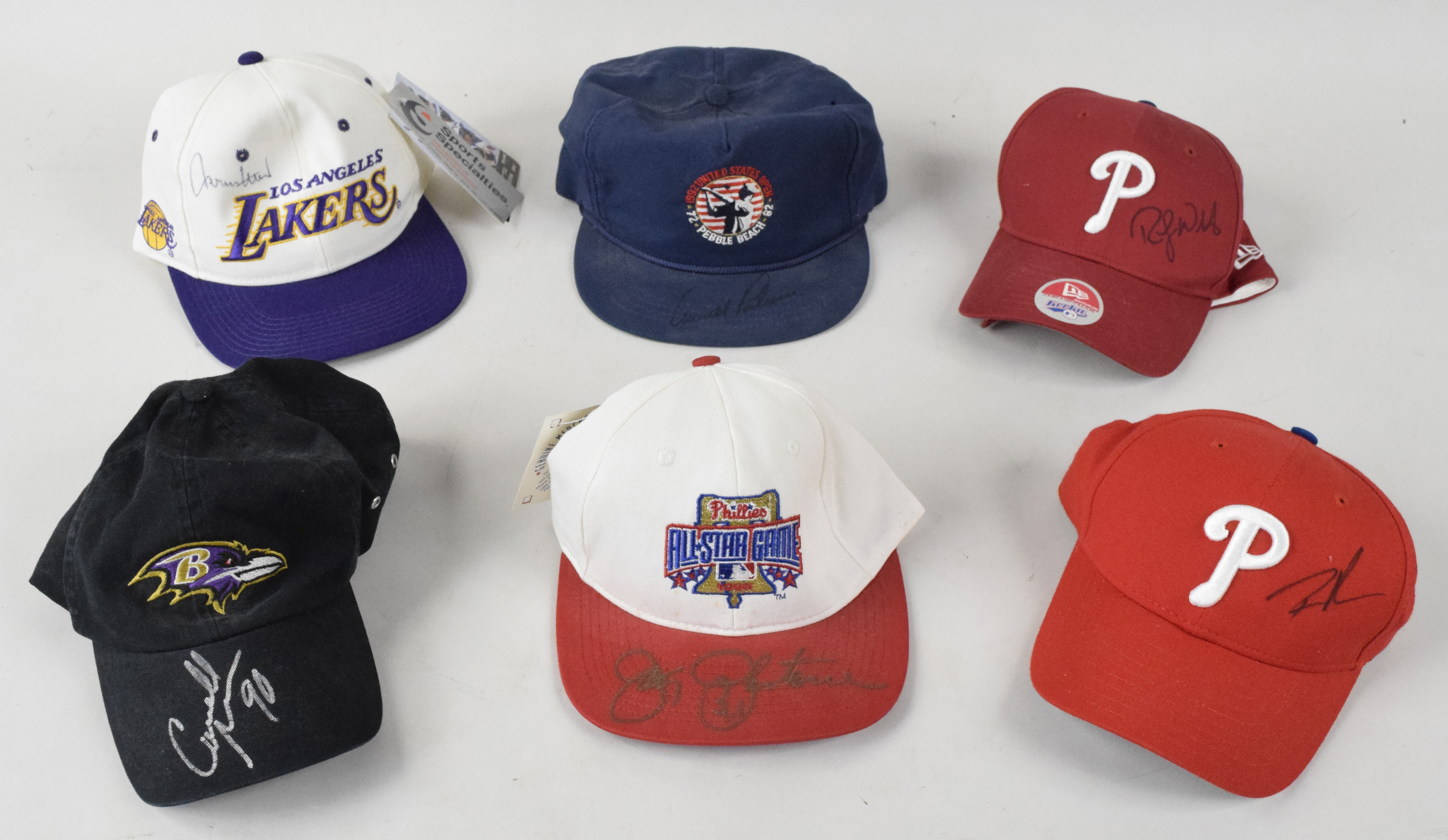 Description:"Multi-sport hat autograph lot of (6), including Jerry West and Arnold Palmer (Sigs. NM/MT). Nice assortment of autographed hats, with (1) L.A. Lakers hat signed by Jerry West, (1) 1992 U.S. Open hat signed by Arnold Palmer, (1) Baltimore Ravens hat signed by Cornell Brown, (1) 1996 Phillies All-Star hat signed by Jay Johnstone; (1) Phillies hat signed by Ryan Madson; and (1) Phillies hat signed by Randy Wolf (MLB authentication sticker affixed). Signatures rate 8 out of 10, and caps appear EX/MT-NM, some with original retail tags. "