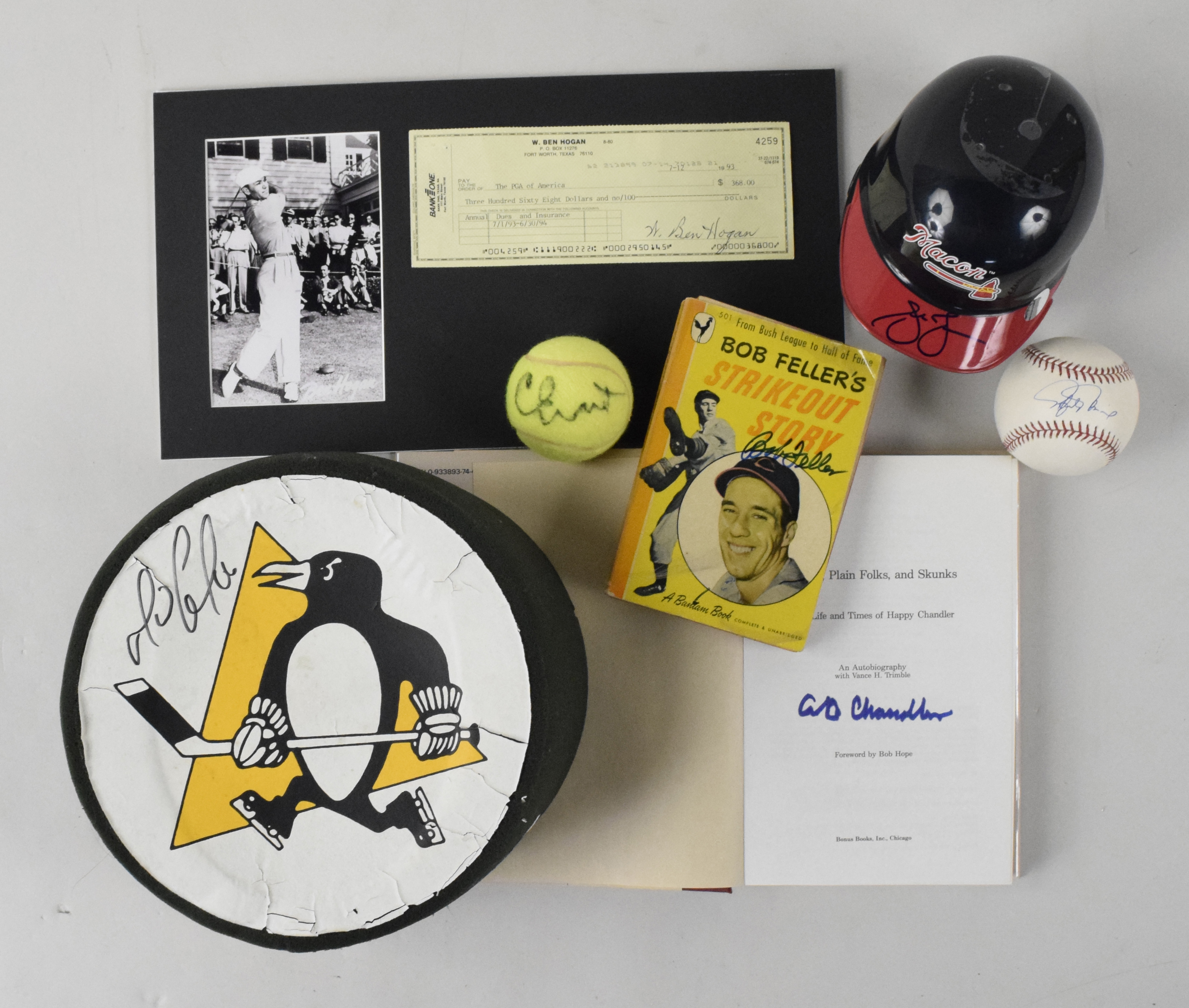 Description:"Multi-sport autograph breakdown value lot with Lemieux, Hogan and Chandler (Sigs. EX-MT). Nice lot of autographs should yield excellent breakdown value, with (1) 1993 check signed by Ben Hogan (adhered to matting); (1) 76ers mini-basketball signed by Andre Iguodala; (2) Penn tennis balls, each signed by Chris Evert; (1) Pittsburgh Penguins ""Puckhead"" hat signed byMario Lemieux; (2) Philadelphia Flyers logo pucks signed by Michael Raffl and Sean Couturier; (2) hardcover books, individually signed on the title pages by Rocky Colavito and A.B. Chandler; (1) softcover books signed on the cover by Bob Feller; (1) Flyers hockey mini-helmet signed by Chris Therien; (1) Bobble Dobbles bronze figurine signed on the base by Gary Dornhoefer (stick broken off figurine but included); (3) Just Minors mini-helmets, individually signed by Andruw Jones, Hank Blalock and Jeff Francoeur; (1) Rawlings NCAA basketball signed by Ray Williams; (1) 1982 All-Star Game breakfast ticket signed by Gary Carter and Sparky Anderson (personalized); (1) B. Selig MLB baseball signed by Rafael Palmeiro and (1) Spalding mini basketball with and unknown signature. Signatures range from 5 to 9 (avg. 7/8) out of 10, and items range VG/EX-NM/MT. "