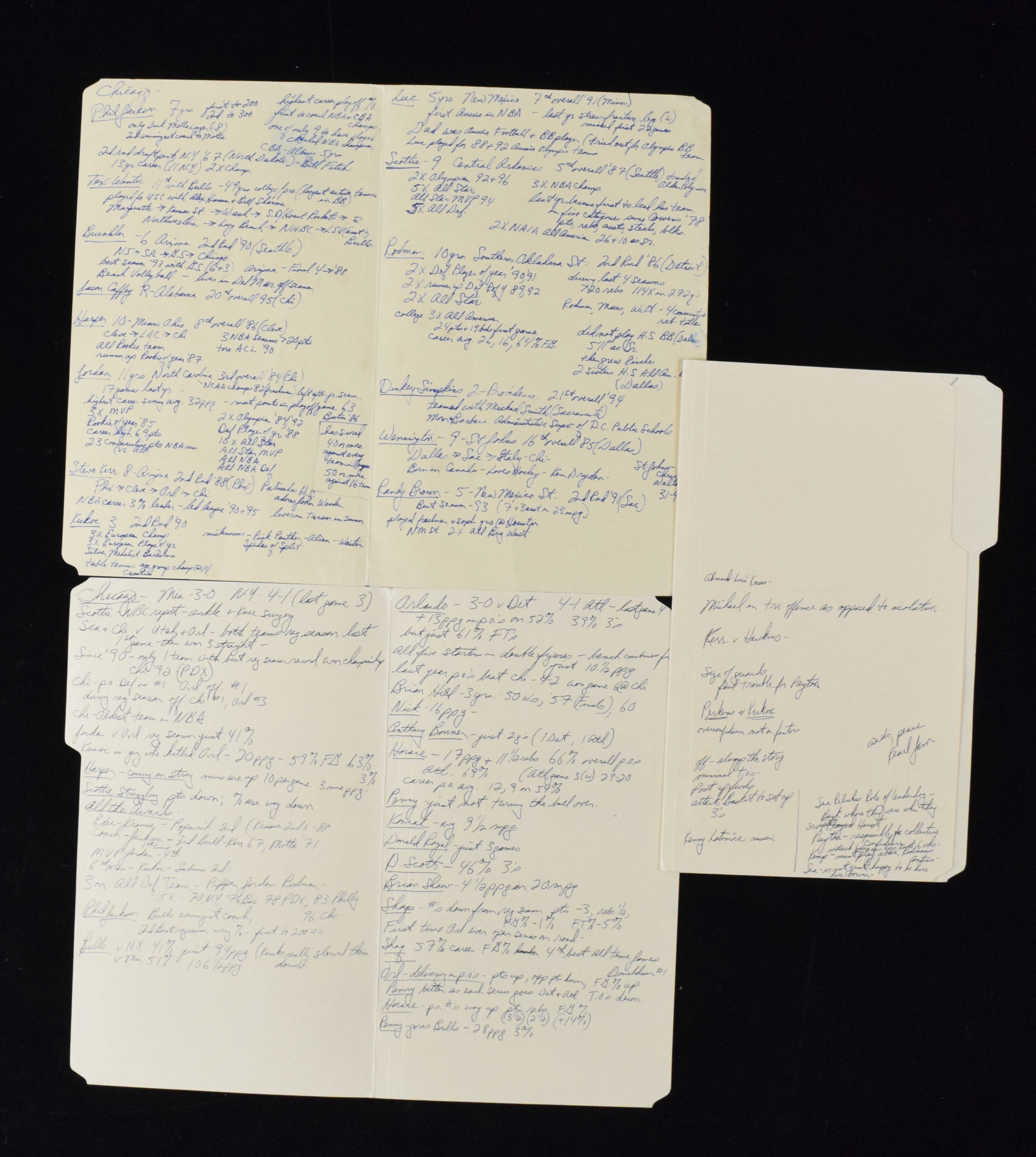Description:Bill Walton's handwritten notes on 1995-96 Chicago Bulls, 1996 Eastern Conference Finals, and 1996 NBA Finals (VG/EX-EX/MT). Includes 9.5"x14.5" manila folder with both sides of the interior covered in Walton's notes on the 1995-96 Bulls which consist of mini bios including Phil Jackson, Michael Jordan, Scottie Pippen, Dennis Rodman, Toni Kukoc, etc; 9.5""x14.5"" manila folder with part of the front, all of the interior, and all of the back containing Walton's 1996 Eastern Conference Finals notes on the matchup between the Bulls vs Orlando Magic; and 9.5"x14.5" manila folder with half of the front and a small part of the interior containing Walton's notes on the 1996 NBA Finals between the Bulls vs Seattle SuperSonics. Includes certificate of provenance from Walton Family: VG/EX-EX/MT