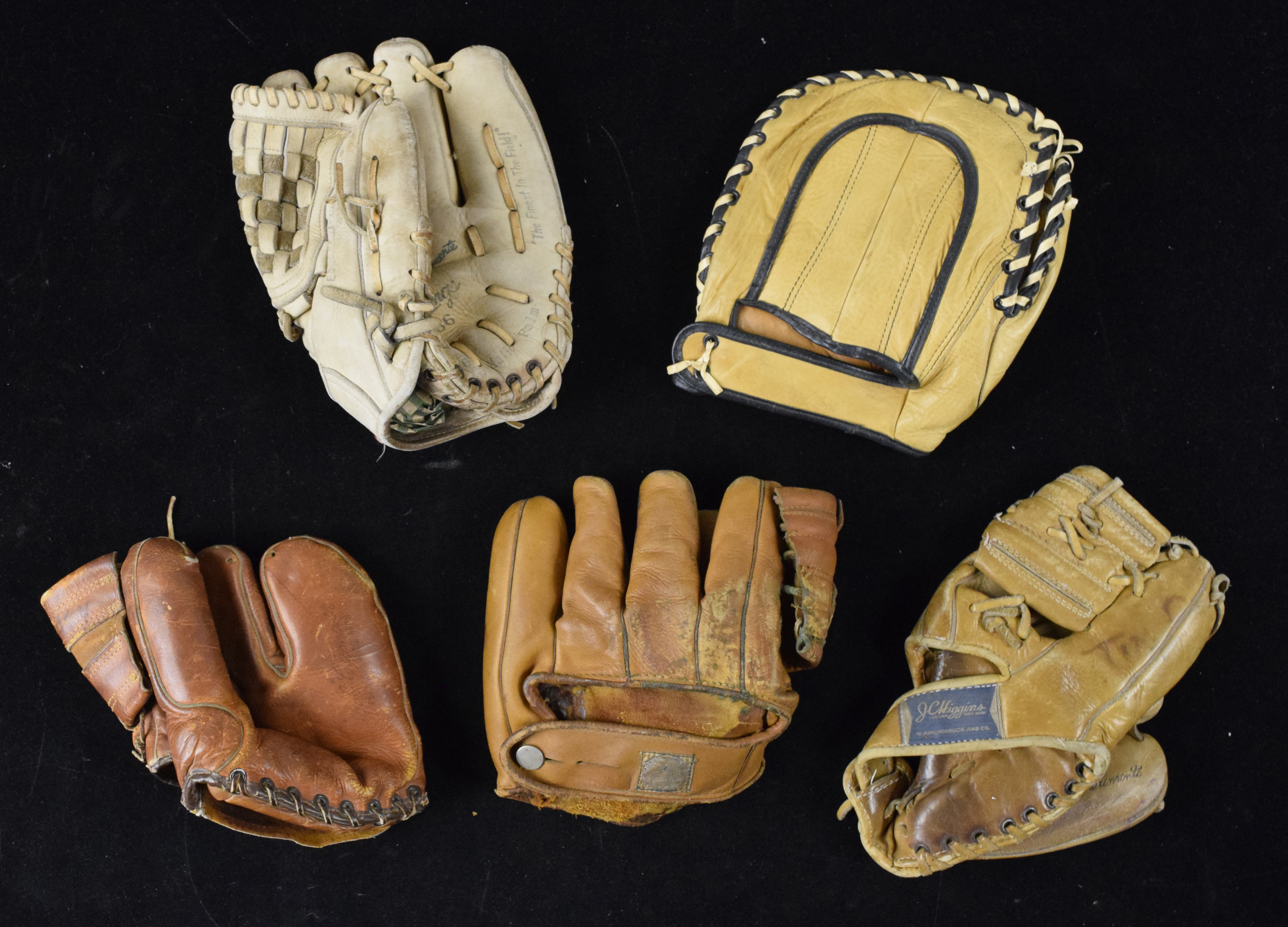 Description:"Lot of (5) store model baseball gloves, including Wagner Co. and Clemente player model, c. 1930s-60s (VG-EX/MT). All are for right-handed throwers. Includes (1) Honus Wagner Co. B107 Frank Gustine model fielder's glove; (1) Rawlings GJ66 Roberto Clemente model fielder's glove; (1) J.C. Higgins 1644 Roberto Clemente model fielder's glove (faint writing in a couple of areas); (1) Franklin Roberto Clemente model fielder's glove; and (1) Denkert BM6 Gus Suhr model baseman's mitt. Range: VG-EX/MT. "