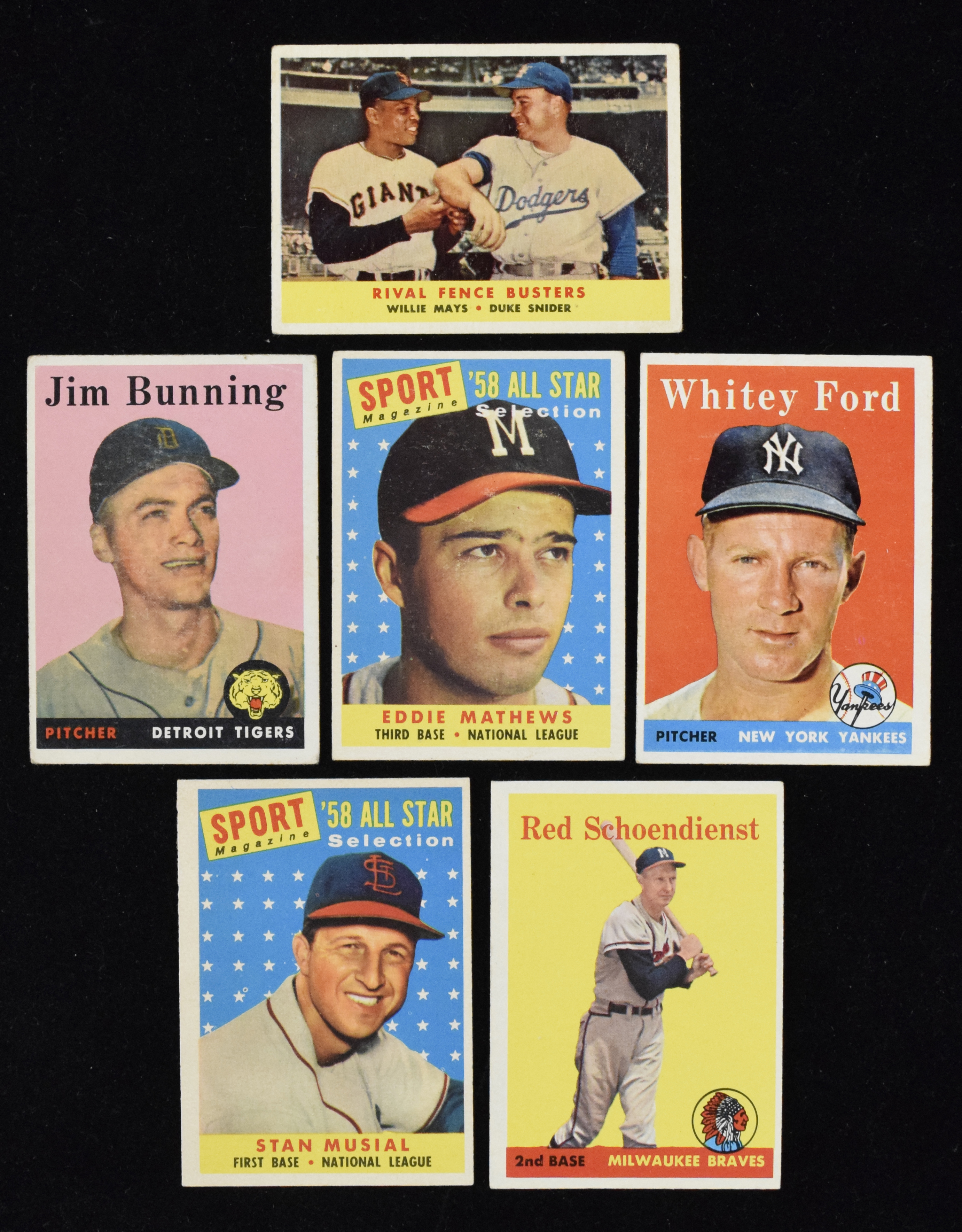 Description:"Lot of (43) 1958 Topps cards with HOFers, including Musial AS, Williams/Snider and Ford (GD-EX). Lot includes commons, minor stars and some stars and Hall of Famers, such as #s 115 Jim Bunning, 190 Red Schoendienst, 320 Whitey Ford, 436 Willie Mays/Duke Snider, 476 Stan Musial AS, 480 Eddie Mathews AS, plus (5) additional All-Star cards and more. Most appear VG-VG/EX. Range: GD-EX. "