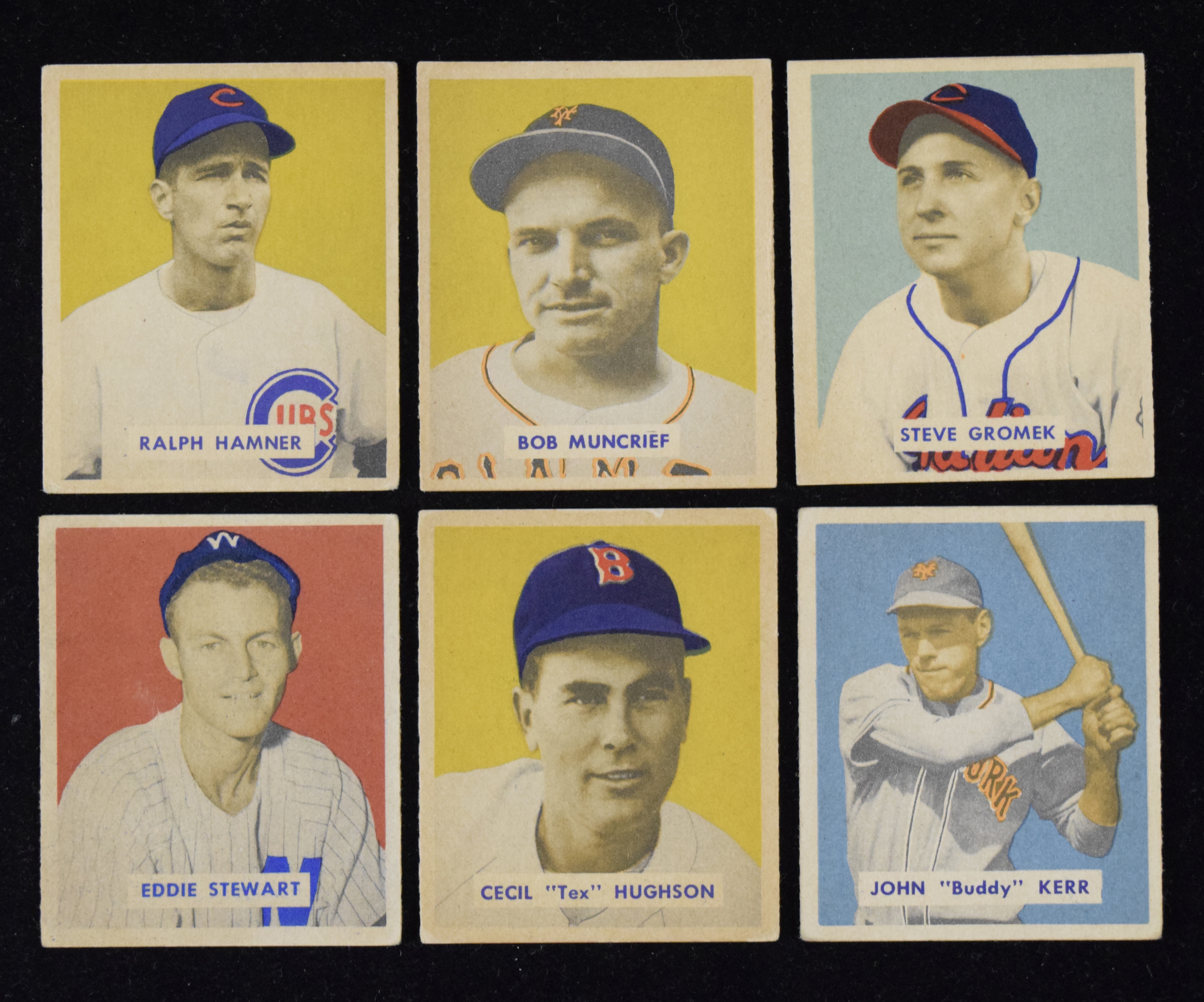 Description:"Clean lot of (12) 1949 Bowman high numbers (VG-EX). Nice eye-appeal lot of cards from the tough 1949 Bowman high number series (#s 145 - 240). Includes #s 221, 215, 212, 199, 198, 190, 186, 173, 163, 157, 234 and 223. Most appear VG/EX with some slightly better and some slightly worse. Range: VG-EX. "