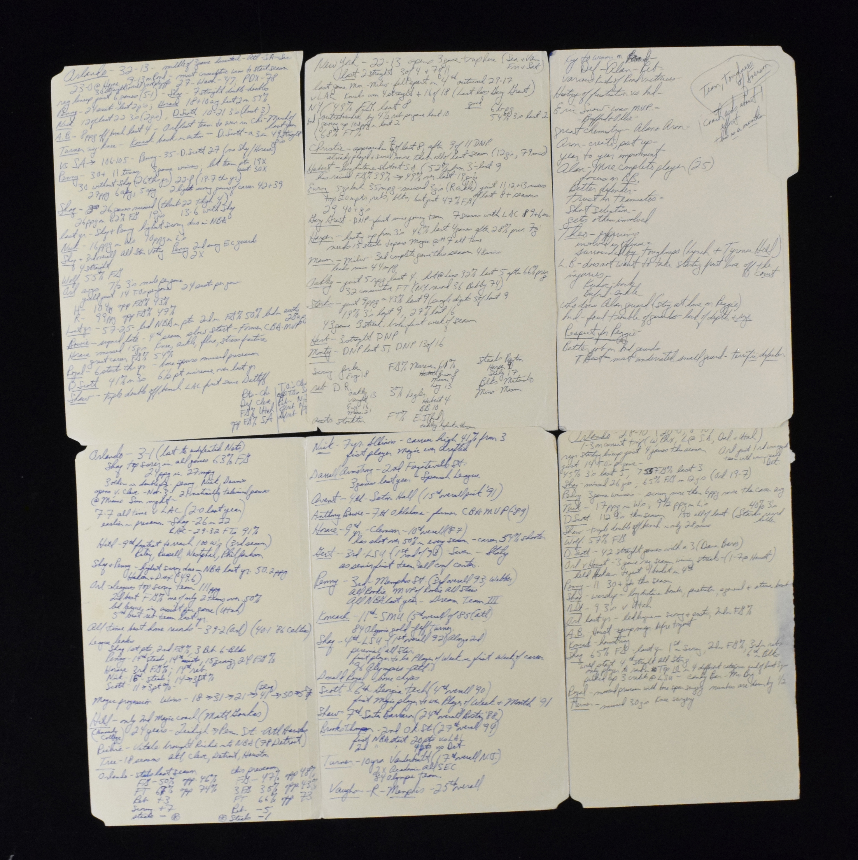 Description:Bill Walton's handwritten NBA team notes c.mid-late 1990s (VG/EX-EX/MT). Consists of (15) 9.5"x14.5" manila folder pages covered in notes on the Orlando Magic (many notes on Shaquille O'Neal), New York Knicks (many notes on Patrick Ewing), Miami Heat, Boston Celtics, and Philadelphia 76ers (mentions toughness of Iverson). Includes certificate of provenance from Walton Family: VG/EX-EX/MT